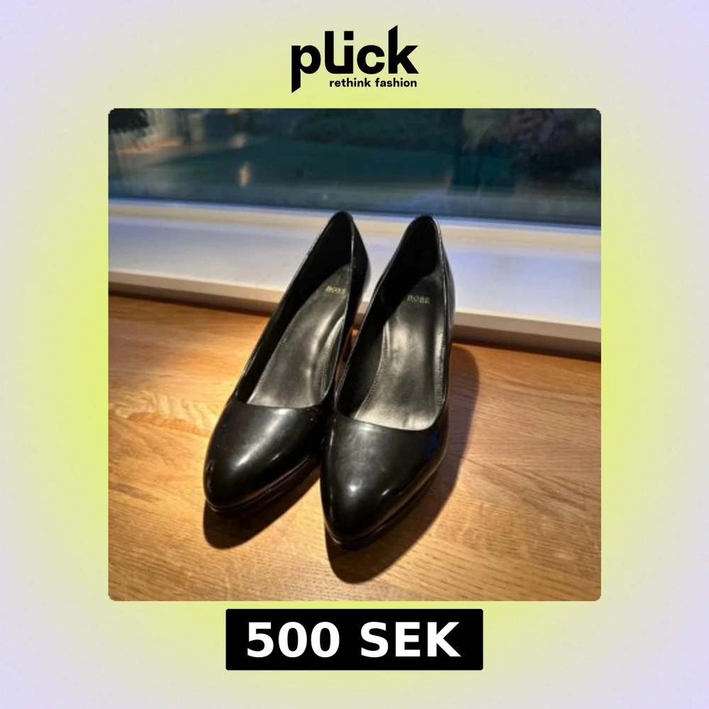 Klassiska svarta högklackade skor från Hugo BOSS med rund tå som är skinlackade. Använda ett fåtal gånger. Nypris ca 3000kr.