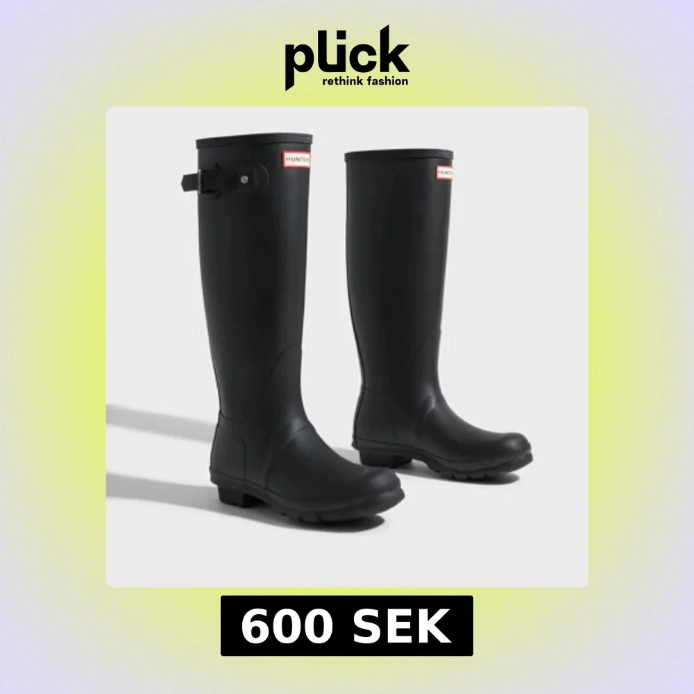 Klassiska svarta höga stövlar från Hunter med ikonisk logga framtill. Tillverkade i slitstarkt syntetmaterial med justerbart spänne på sidan och grov sula för extra grepp. Perfekta för regniga dagar och festivaler.
