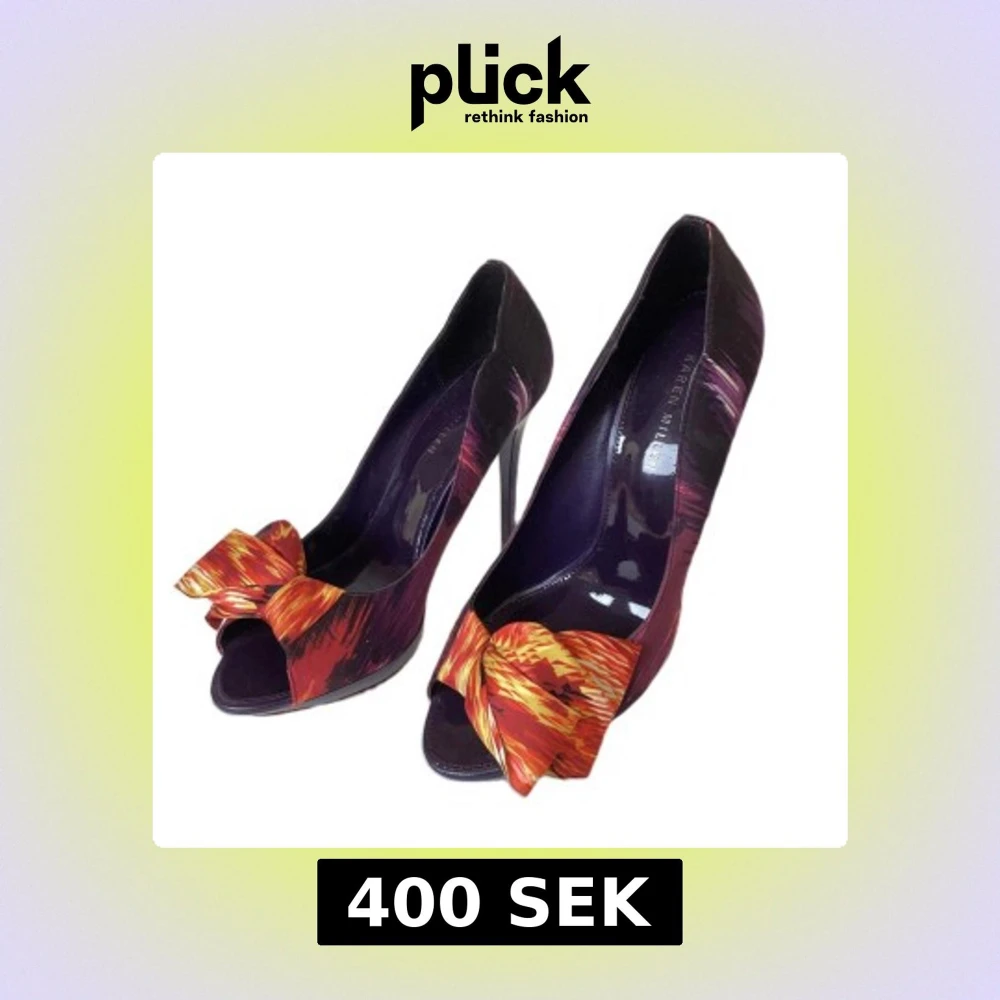 Snygga pumps i lila med abstrakt mönster och stora orange-röda rosetter framtill. Skorna har öppen tå, hög klack och plattform. Materialet är satinliknande och ger en glansig finish. Perfekt för dig som vill sticka ut med färg och cool design.