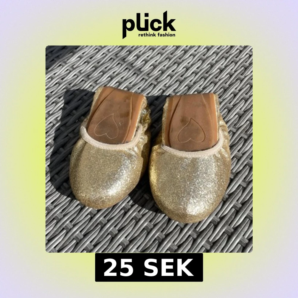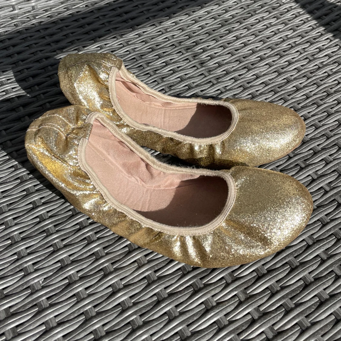 Snygga ballerinaskor i guld med glittrig yta och rund tå. Skorna har elastisk kant för skön passform. Perfekt att som extraskor i väskan!