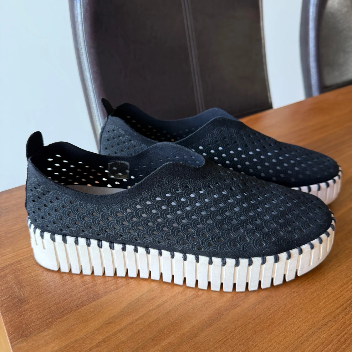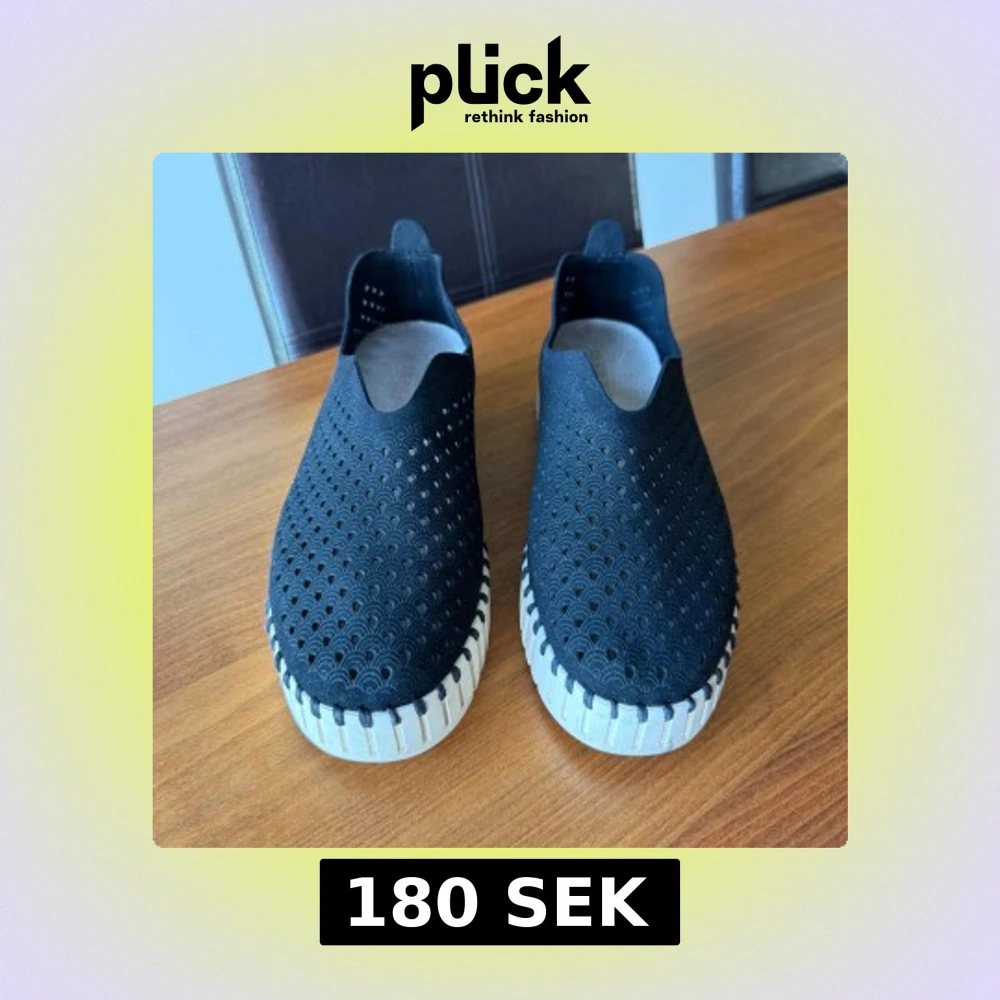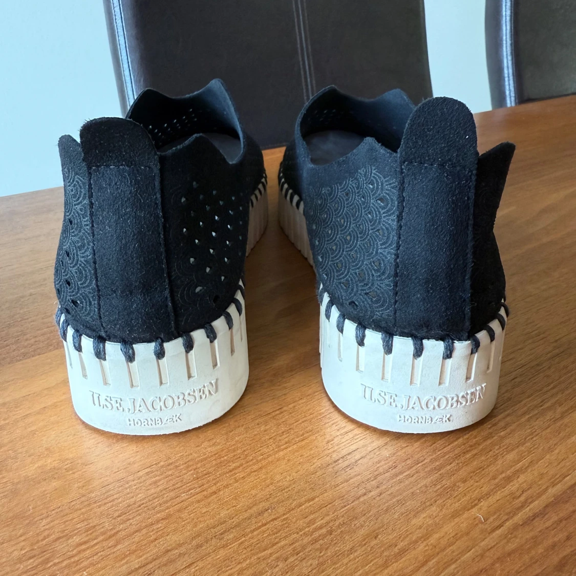 Svarta slip-on skor från Ilse Jacobsen med perforerat mönster och vit, räfflad sula. Skorna har rund tå och är tillverkade i syntetmaterial med snygga detaljer på hälen. Perfekta för dig som gillar stilren och modern design.