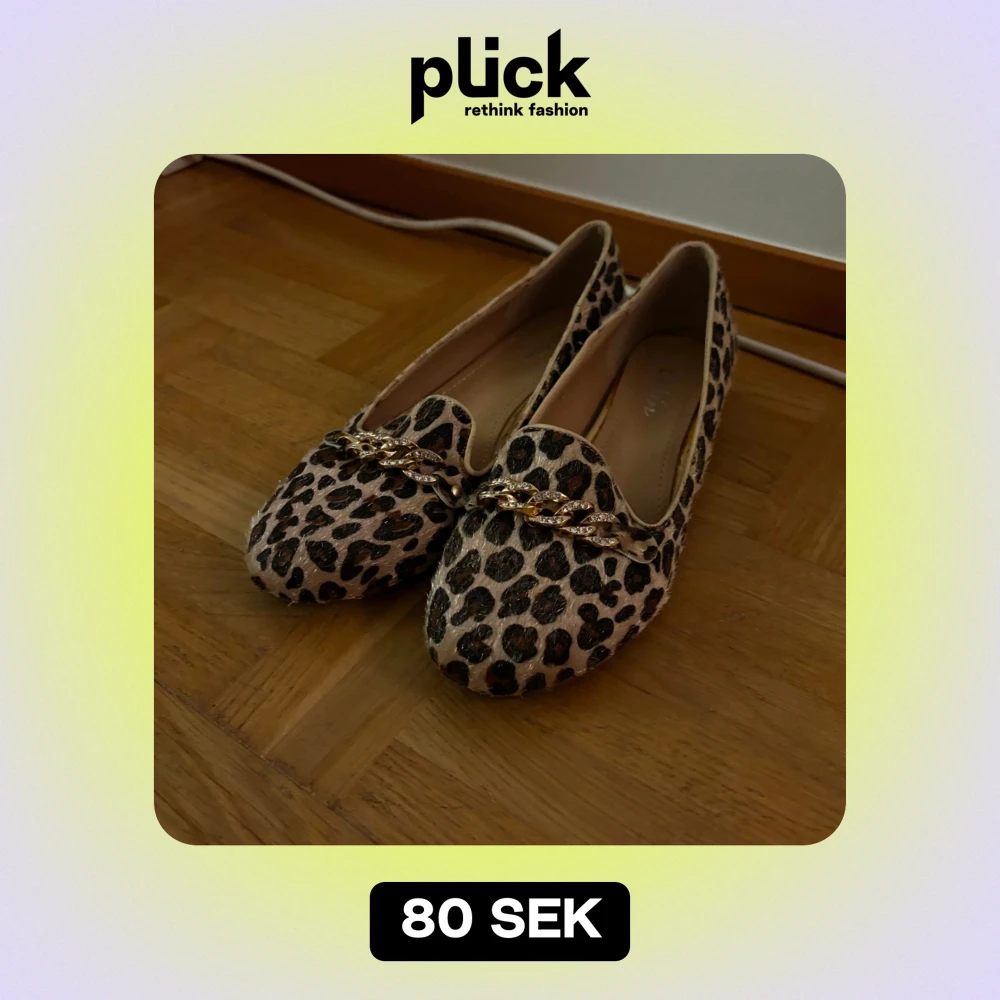 Snygga ballerinaskor i leopardmönster. De har en dekorativ guldkedja framtill som ger en extra touch. Perfekta för både vardag och fest!