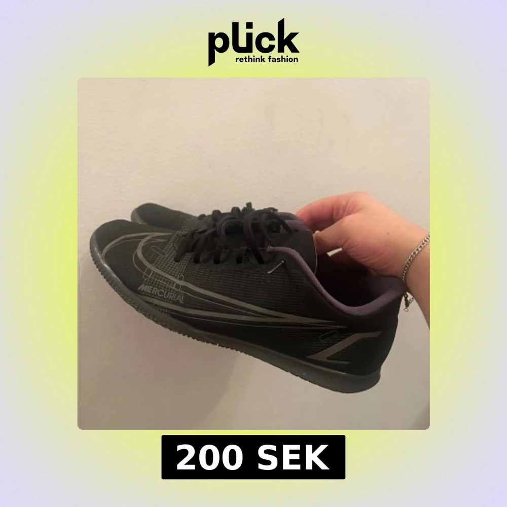 Säljer ett par svarta Nike Mercurial fotbollsskor med grå detaljer och logga. Skorna har snörning, platt sula och rund tå. Ovandelen är i syntetmaterial och insidan är fodrad i ljuslila. Perfekta för inomhusspel och snabba vändningar.