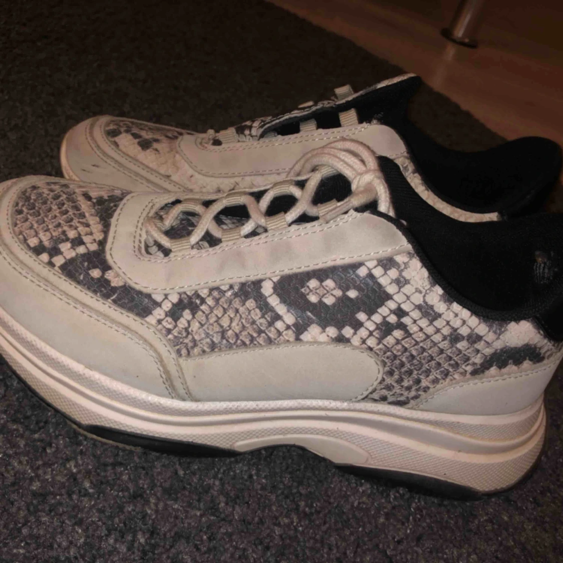 Skor vita med lite mönster Snöre saknas på en dock Använda i våras så ändå bra skick!
