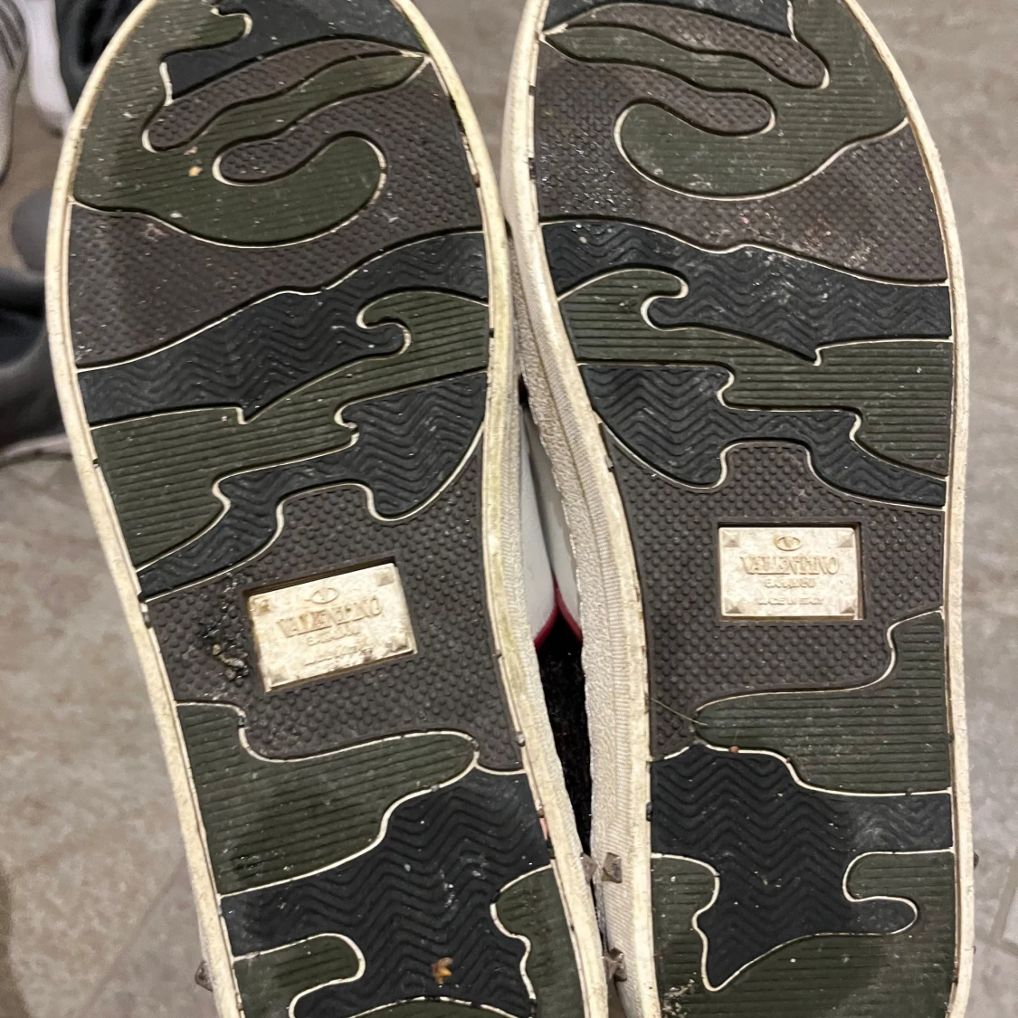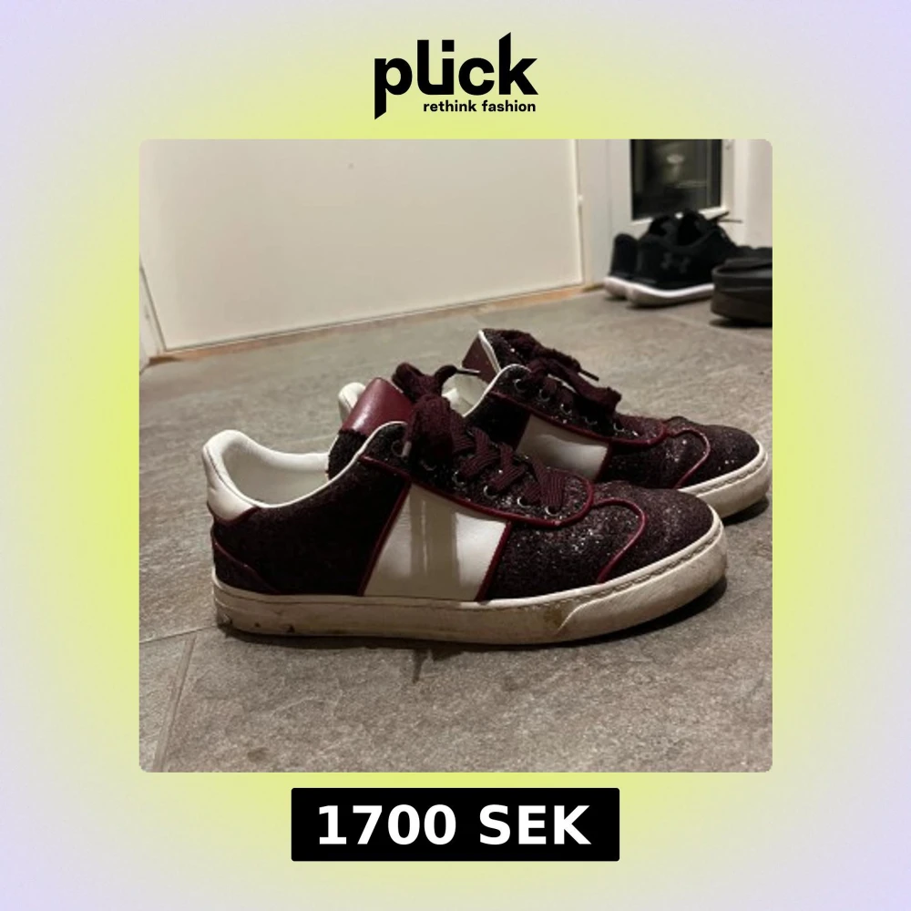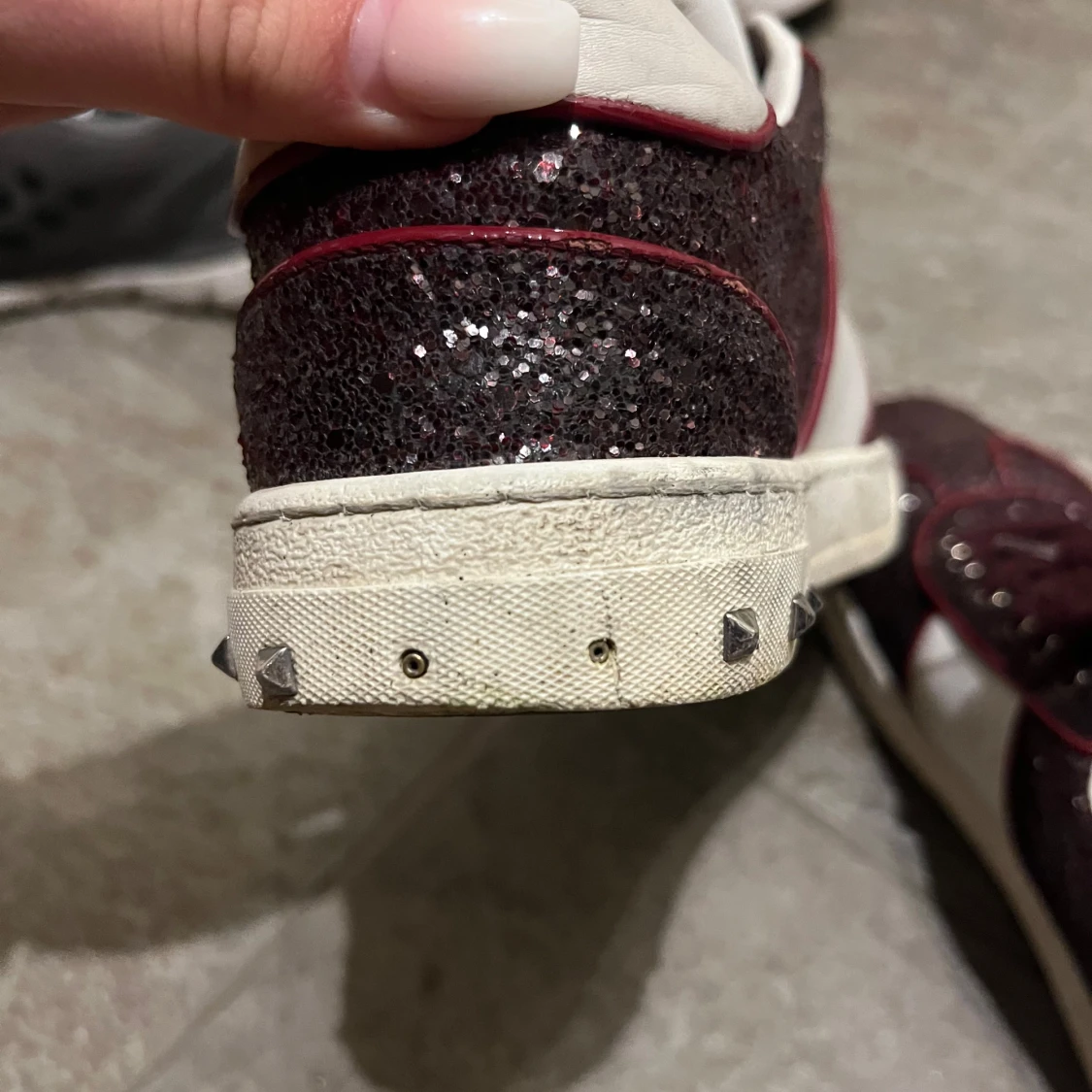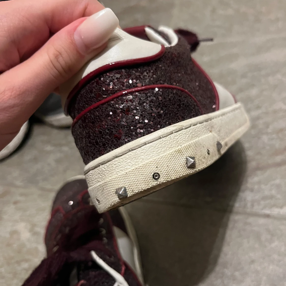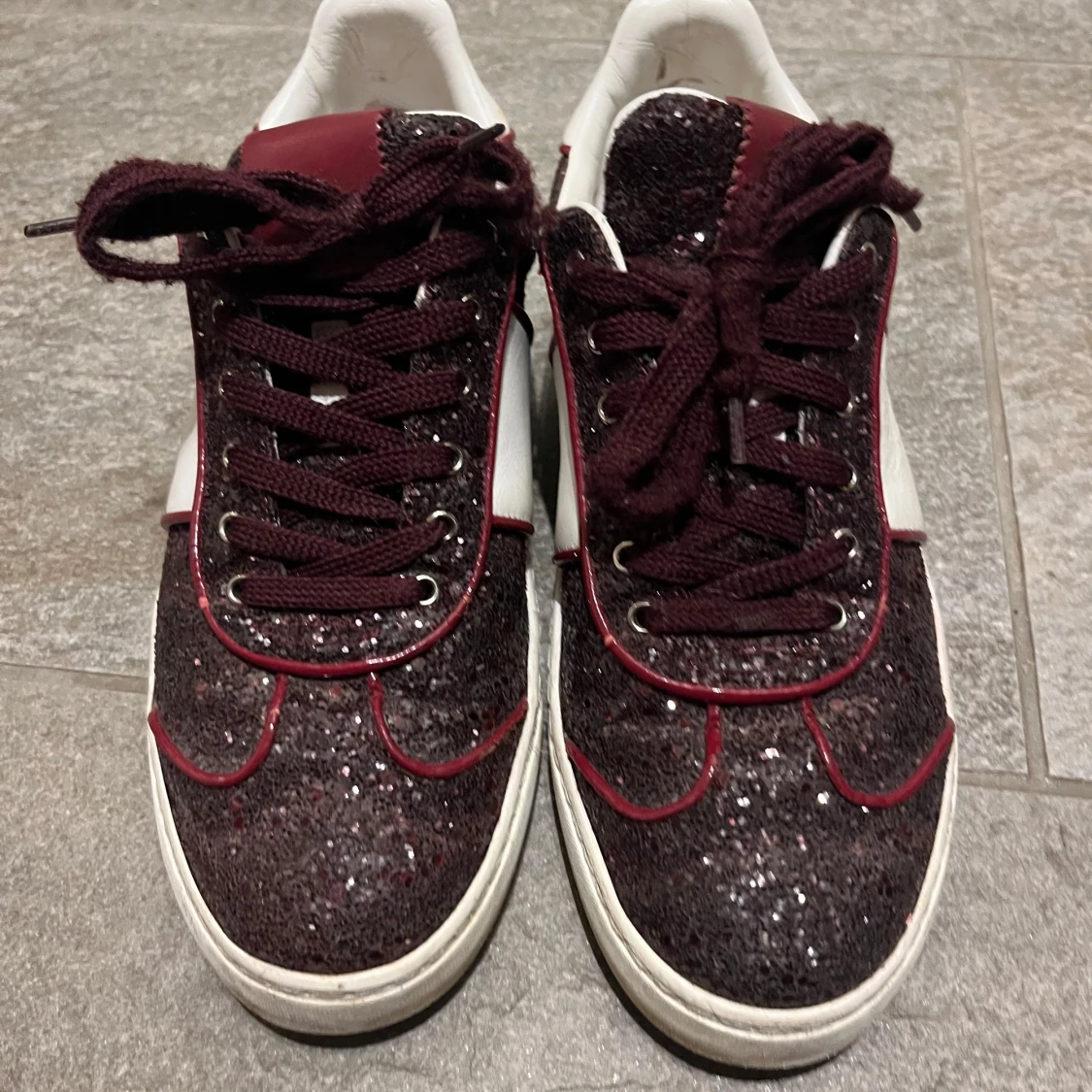 Snygga Valentino Fly Crew skor i vinrött glitter med vita skinnpaneler och mörkröda detaljer. Skorna har snörning, rund tå och coola nitar på hälen. Yttersulan har ett unikt camouflagemönster. Perfekta för dig som vill sticka ut med stil. Några nitar har lossnat men man kan köpa nya och sätta fast. (Tvättas och rengörs innan köp)