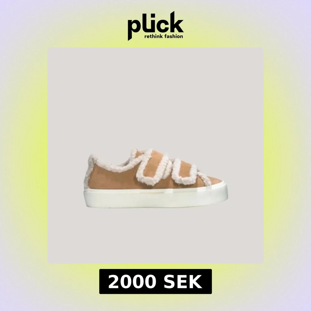Sneakers i beige mocka med vit fuskpäls längs kanterna och kardborreband.