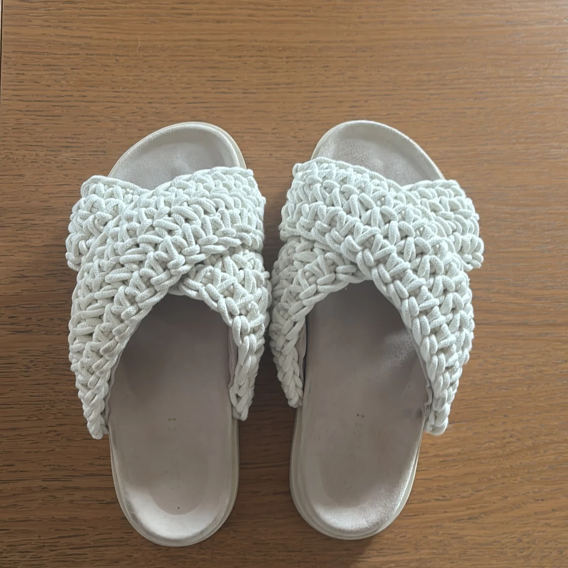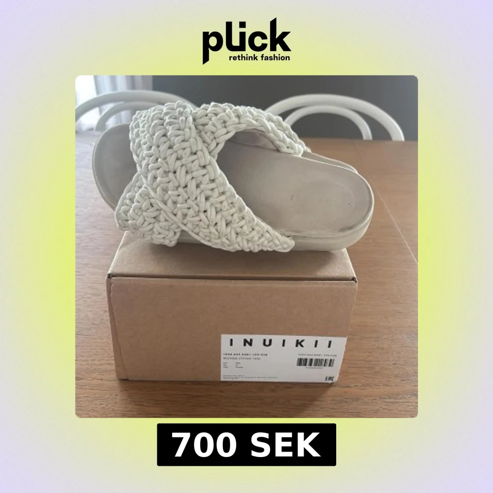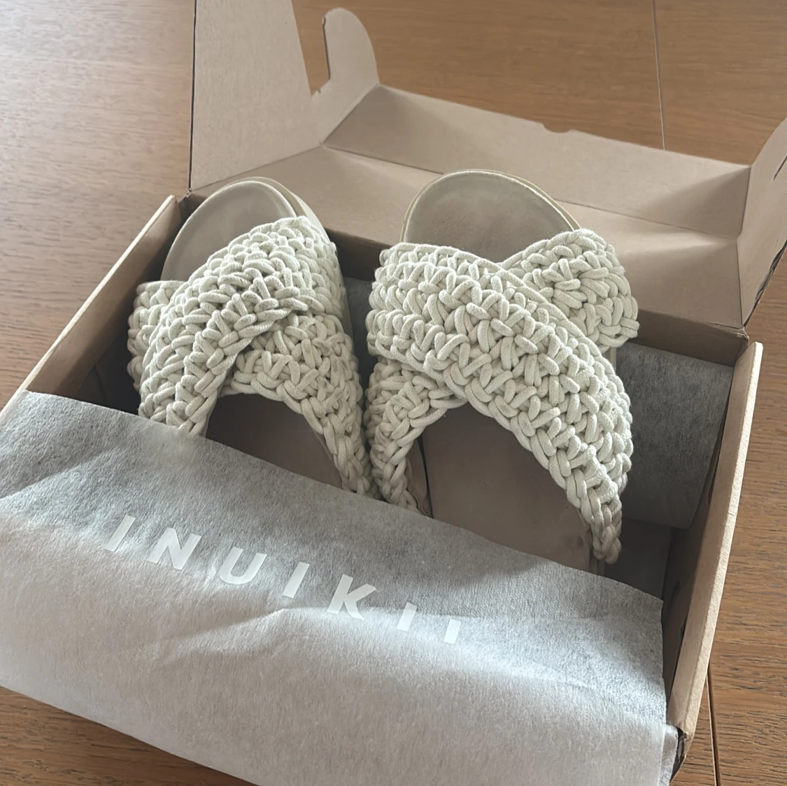 Snygga sandaler från Inuikii i beige med breda, flätade band i textil som korsar över foten. Platt sula och öppen tå ger en chill vibe, perfekt för varma dagar. Stilren design som sticker ut med sitt grova, stickade material.