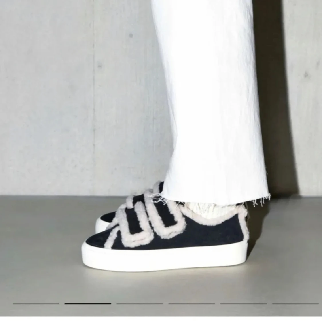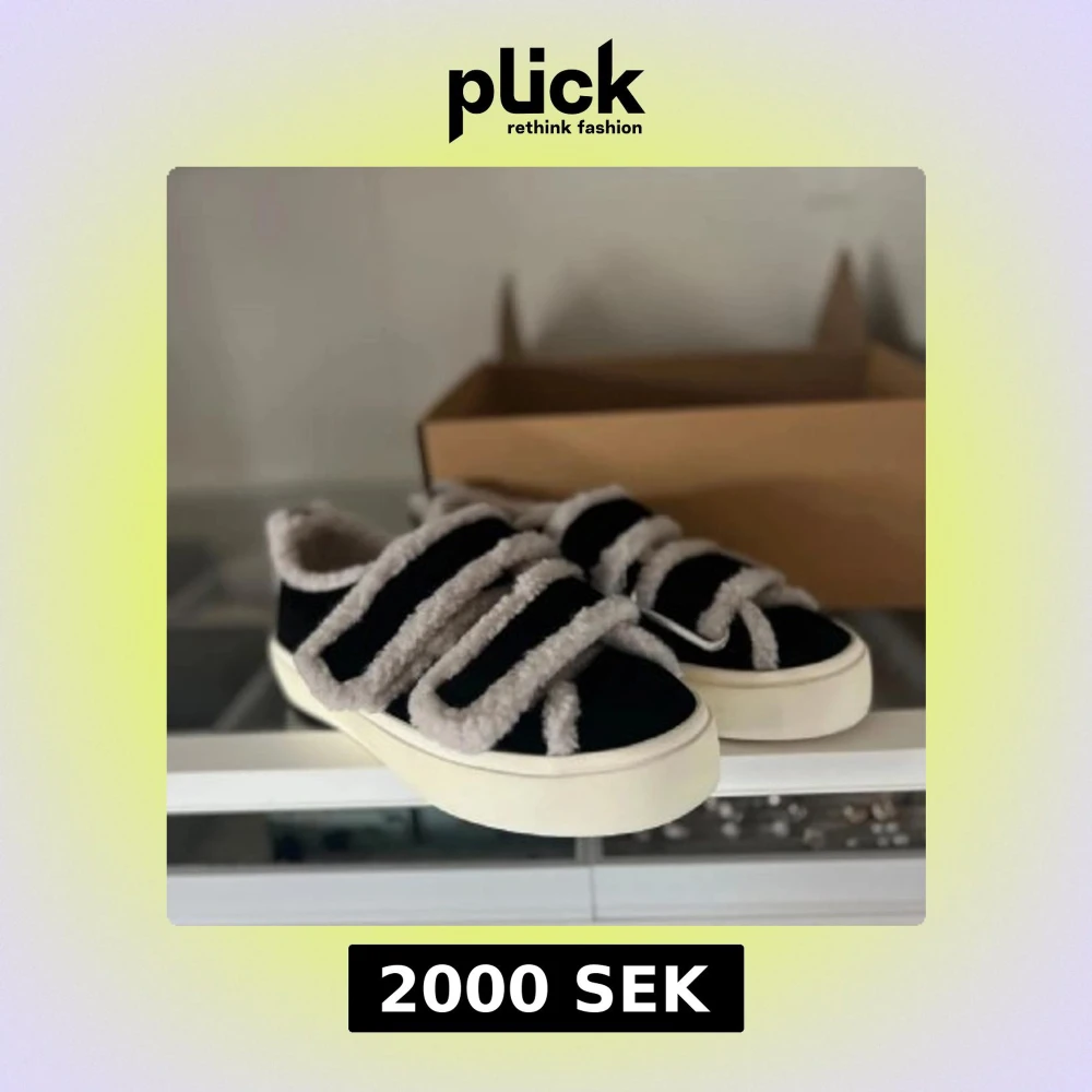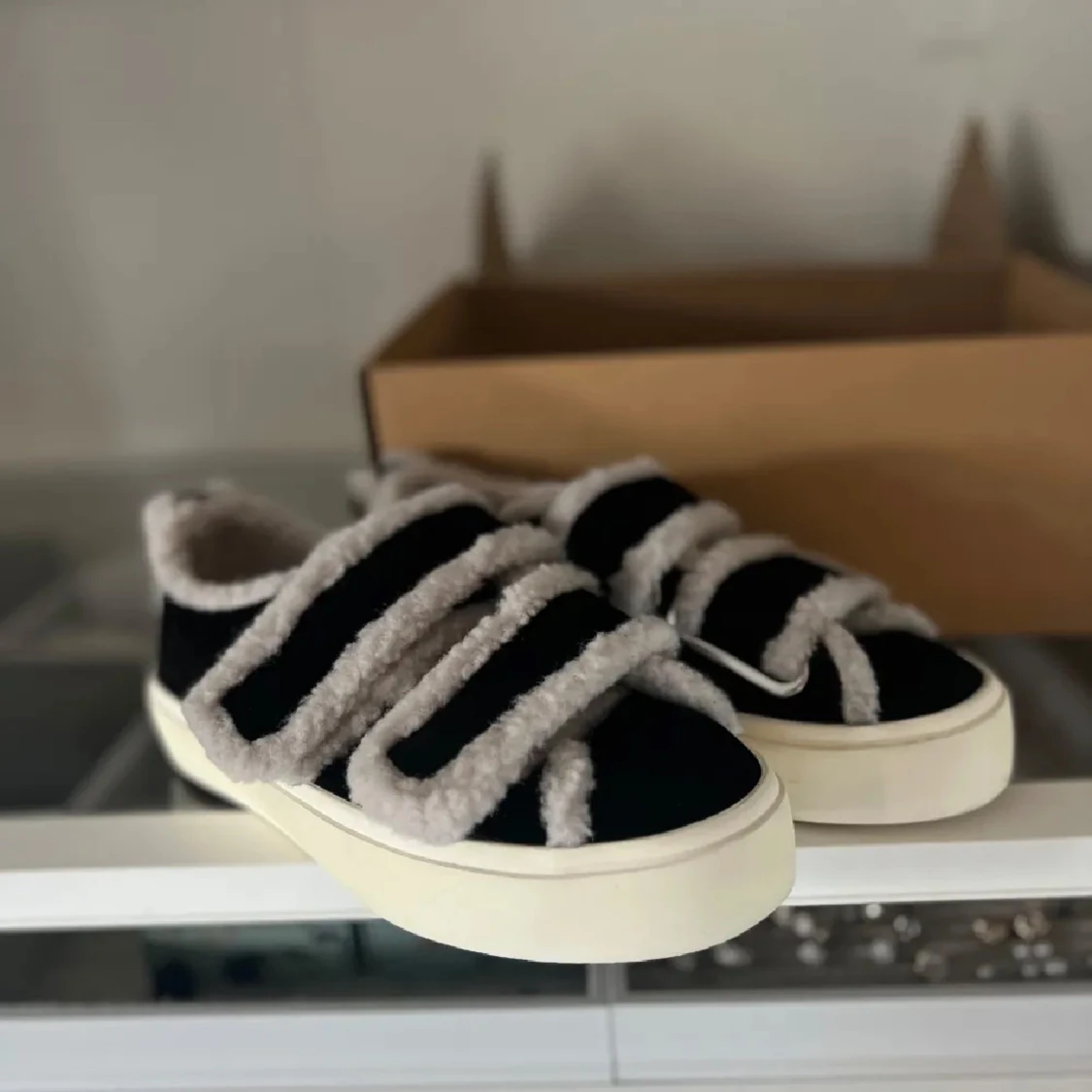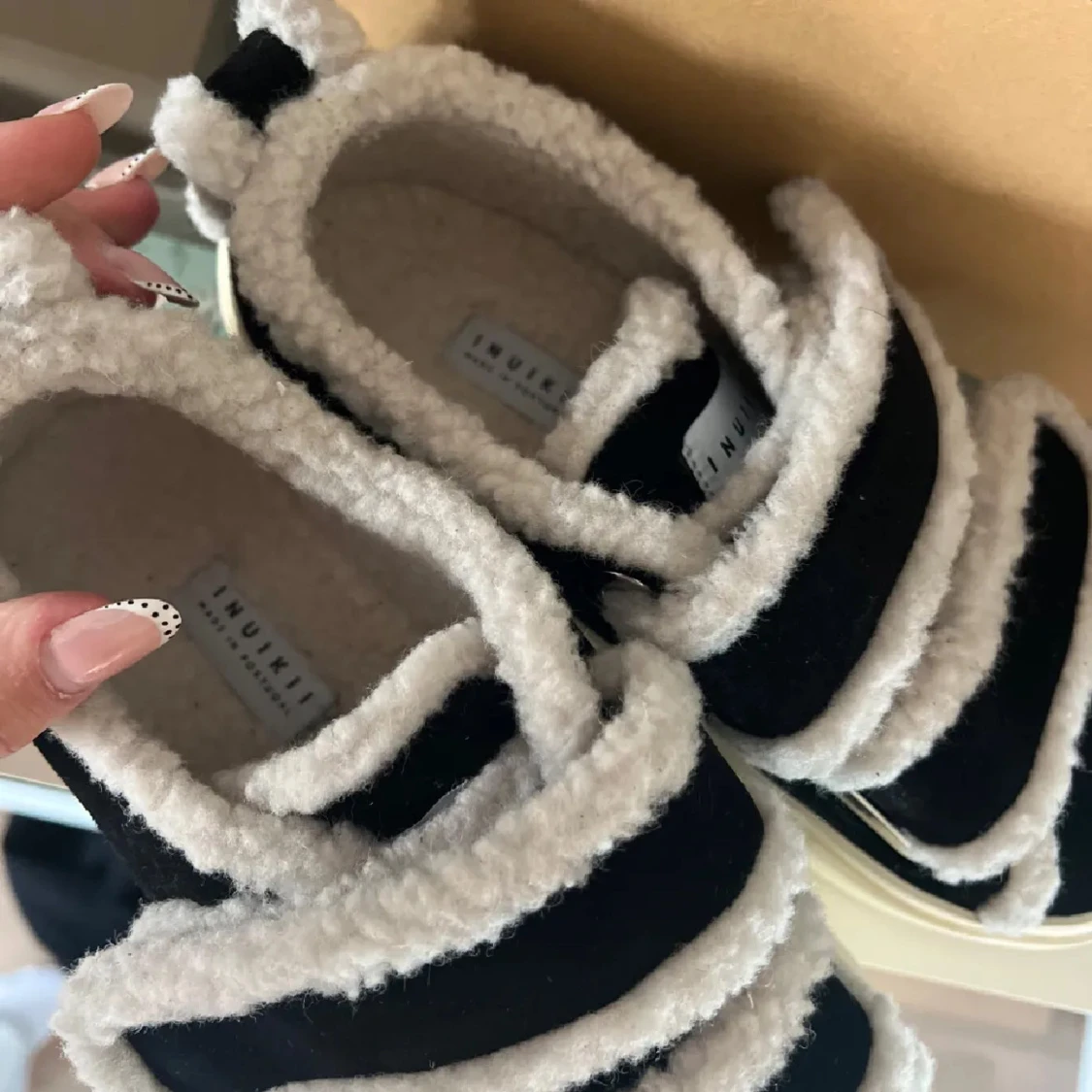 Intressekoll på mina svarta sneakers från Inuikii med fluffiga teddy-detaljer i vitt och breda kardborreband. Skorna har en platt vit sula och rund tå, samt är fodrade med mjukt teddy-material för extra komfort, perfekt för vintern. Skriv om intresse och för prisförslag