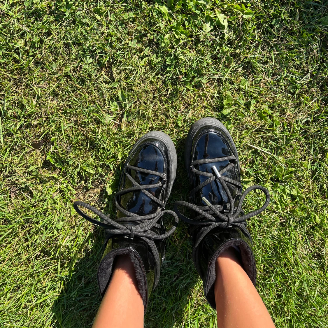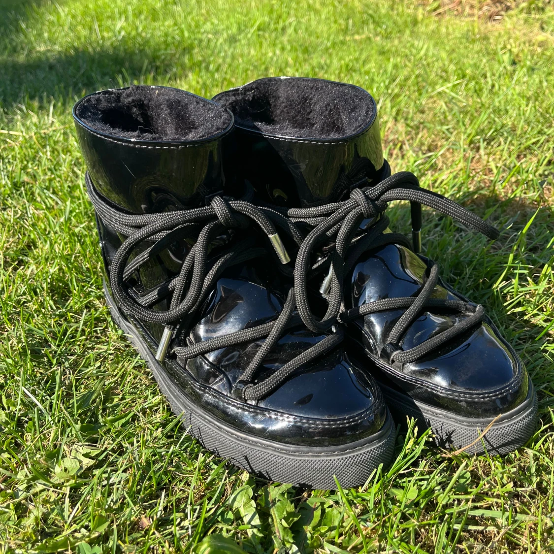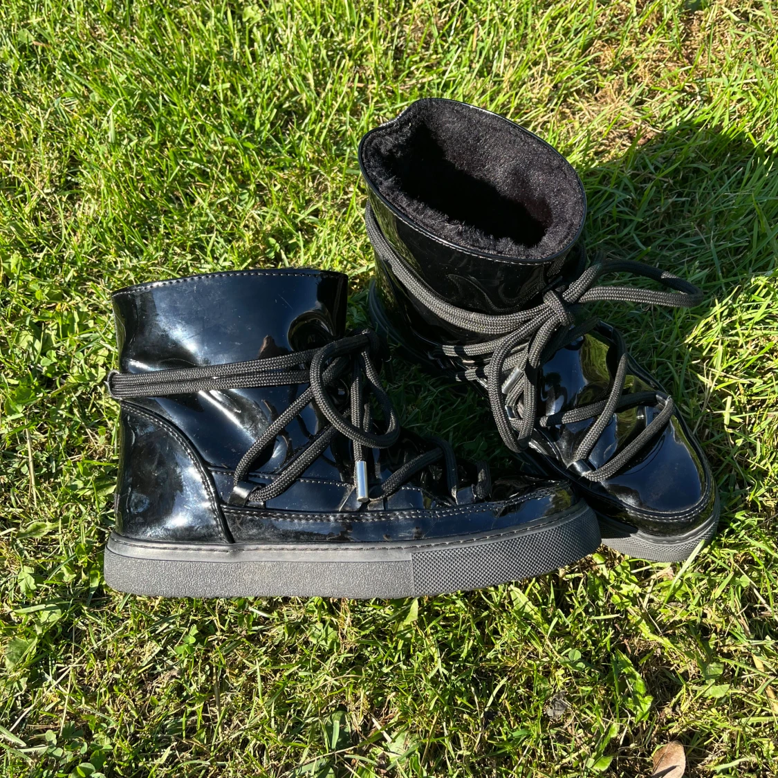 Snygga svarta Inuikii stövlar i glansigt läder med fårskinnsfoder. Skorna har kraftiga svarta snören som går runt hela skon och en platt sula. Perfekta för kalla dagar när du vill hålla stilen och värmen.
