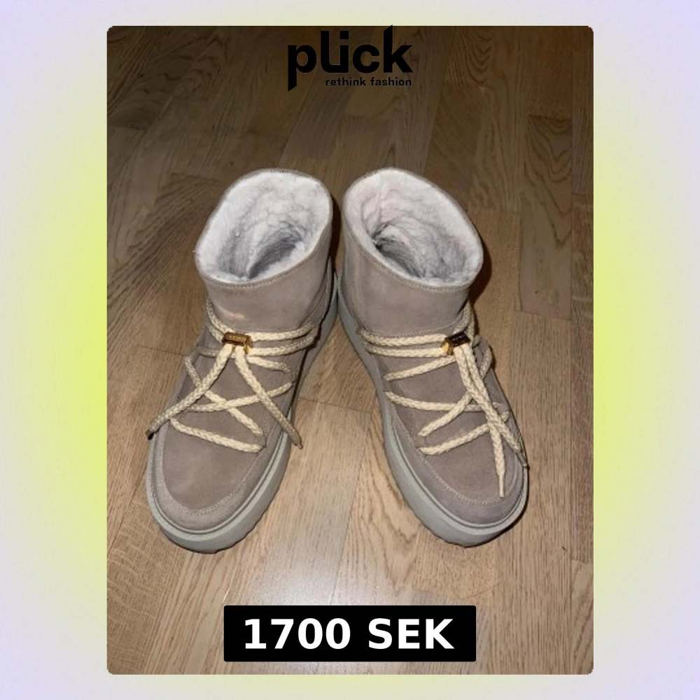Säljer ett par beige INUIKII Boots Classic Low Platform. Skorna har mockayta och rejäla, krämfärgade snören med gulddetaljer. Perfekta för kalla dagar när du vill hålla stilen och värmen.