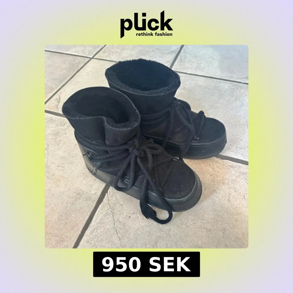 Säljer ett par svarta Inuikii moon boots med snörning och rund tå. Skorna är fodrade med mjukt material och har en ovandel i mocka och detaljer i skinn. Perfekta för kalla dagar med sin chunky sula och varma insida. ullen vid hälen på båda skorna är uppskavd så där är det ingen ull (sista bilderna)