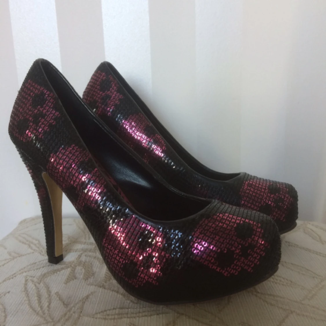 Jätte snygga skor från Iron Fist. Svarta/rosa paljetter med mönster som döskallar.