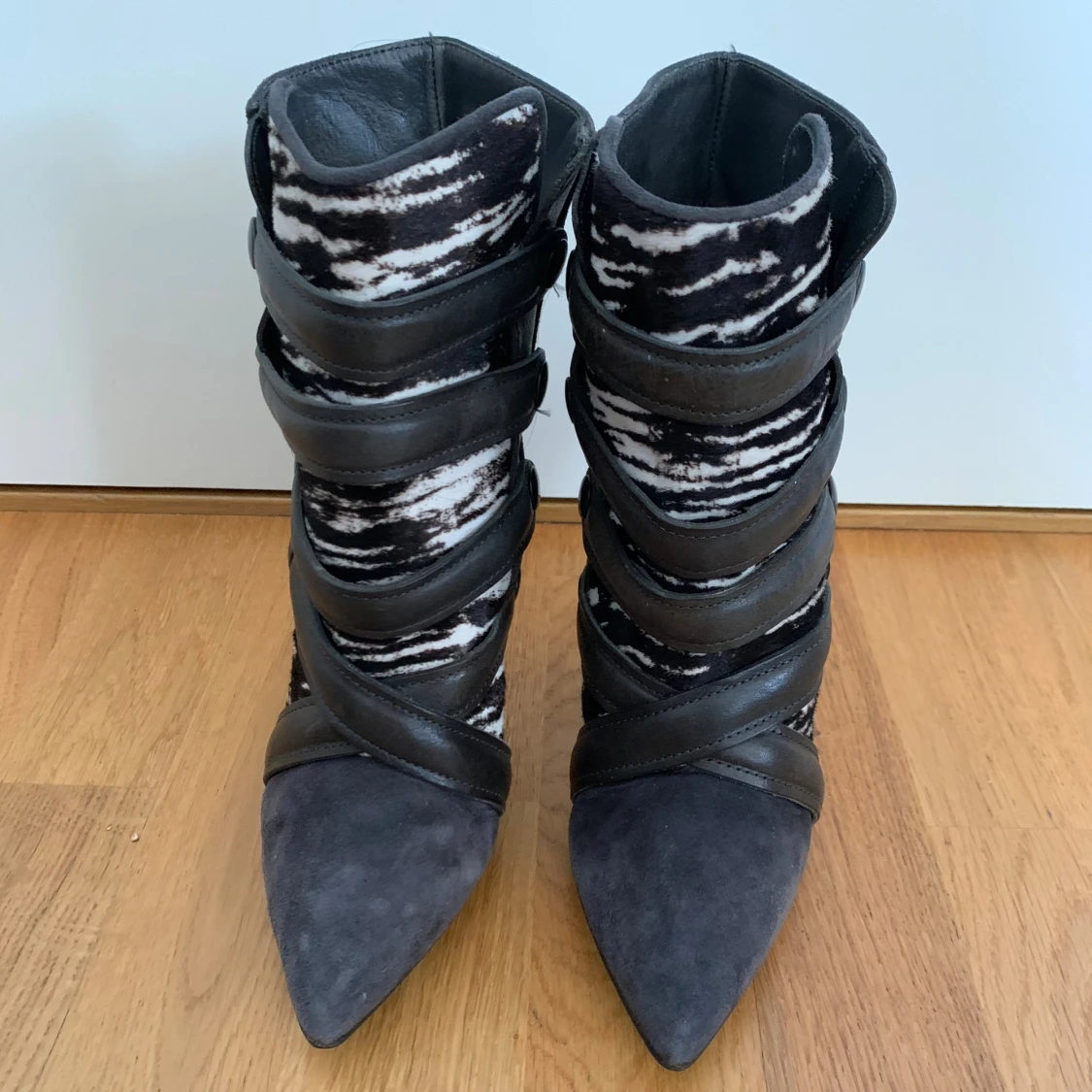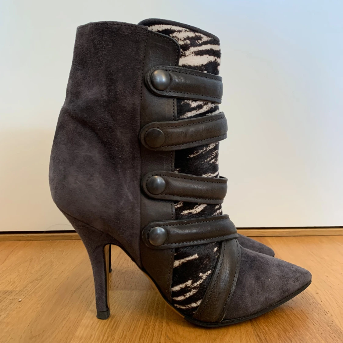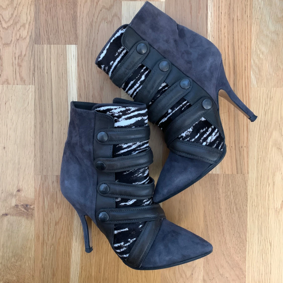 Unika stövletter med spetsig tå och hög klack i mörkgrå mocka och svart skinn. Framsidan har coola zebra-mönstrade paneler i svart och vitt, dekorerade med breda remmar och stora knappar. Perfekt för dig som vill sticka ut med din stil.