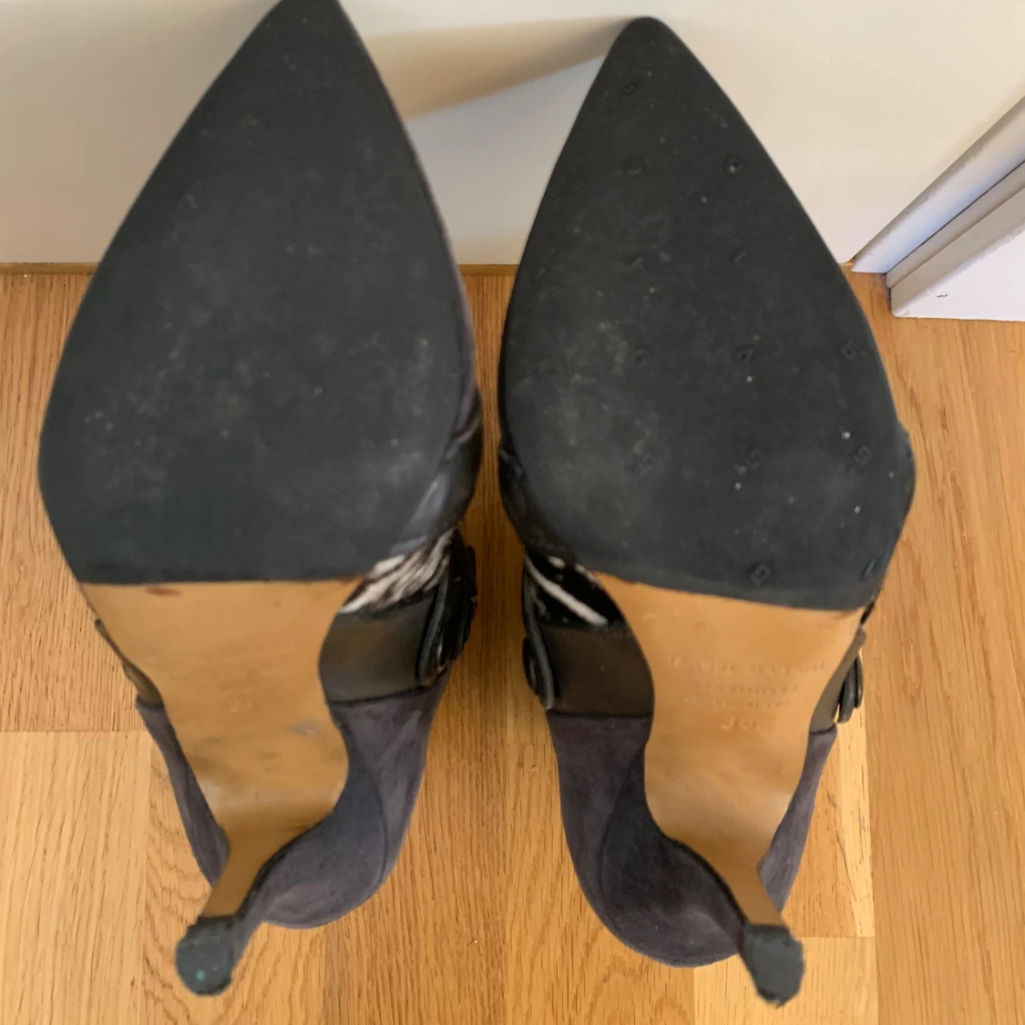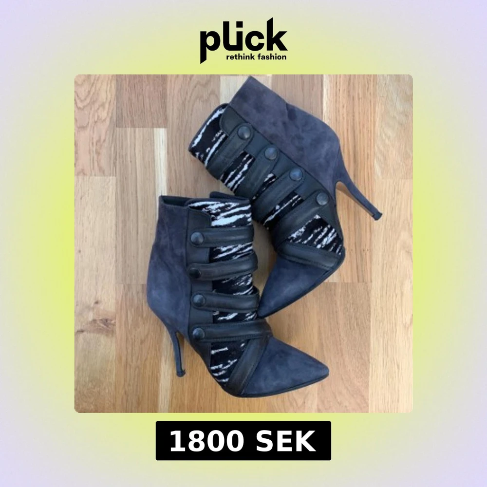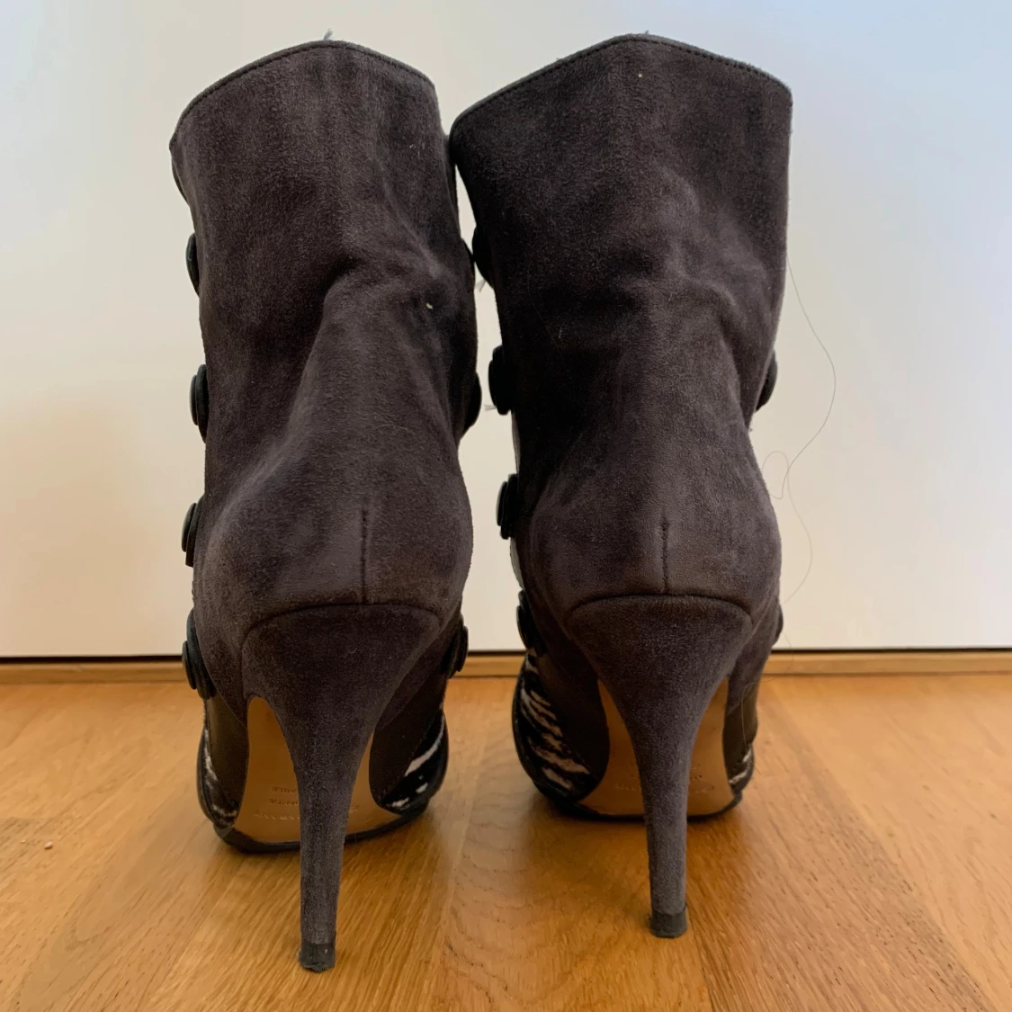 Unika stövletter med spetsig tå och hög klack i mörkgrå mocka och svart skinn. Framsidan har coola zebra-mönstrade paneler i svart och vitt, dekorerade med breda remmar och stora knappar. Perfekt för dig som vill sticka ut med din stil.