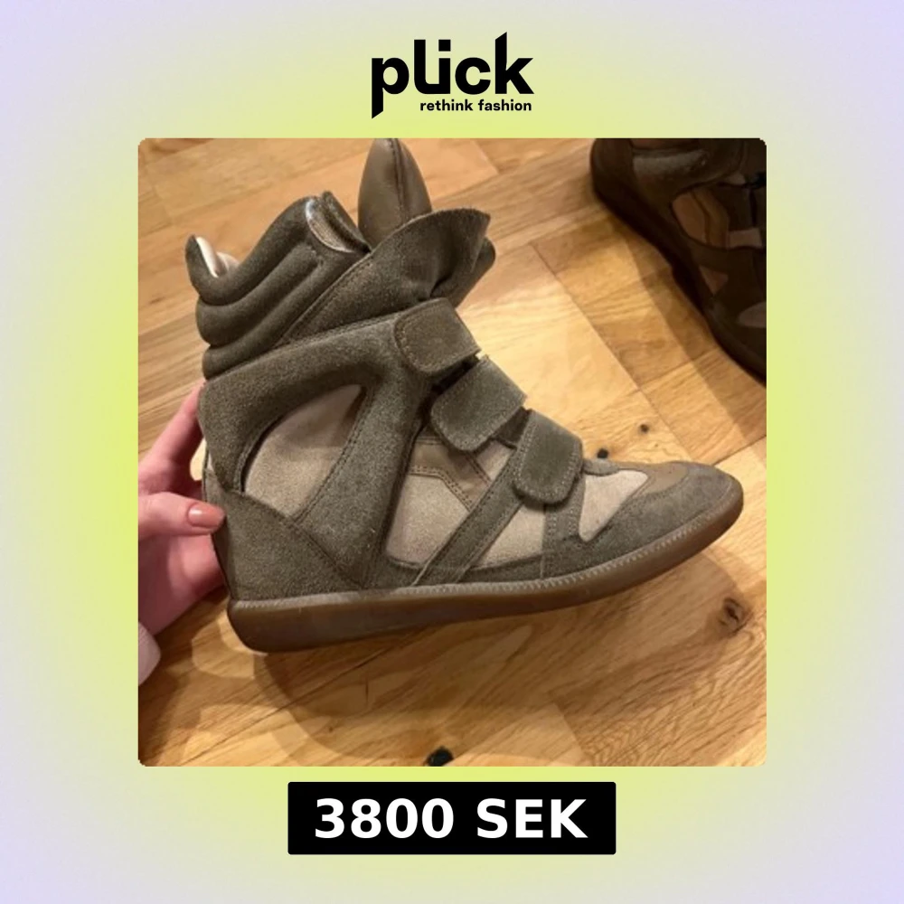 Coola Isabel Marant sneakers i olivgrön och beige mocka med högt skaft och dolda kilklackar. Skorna har kardborreband, rund tå och detaljer i skinn. Perfekta för dig som vill ha en sportig men edgy look.