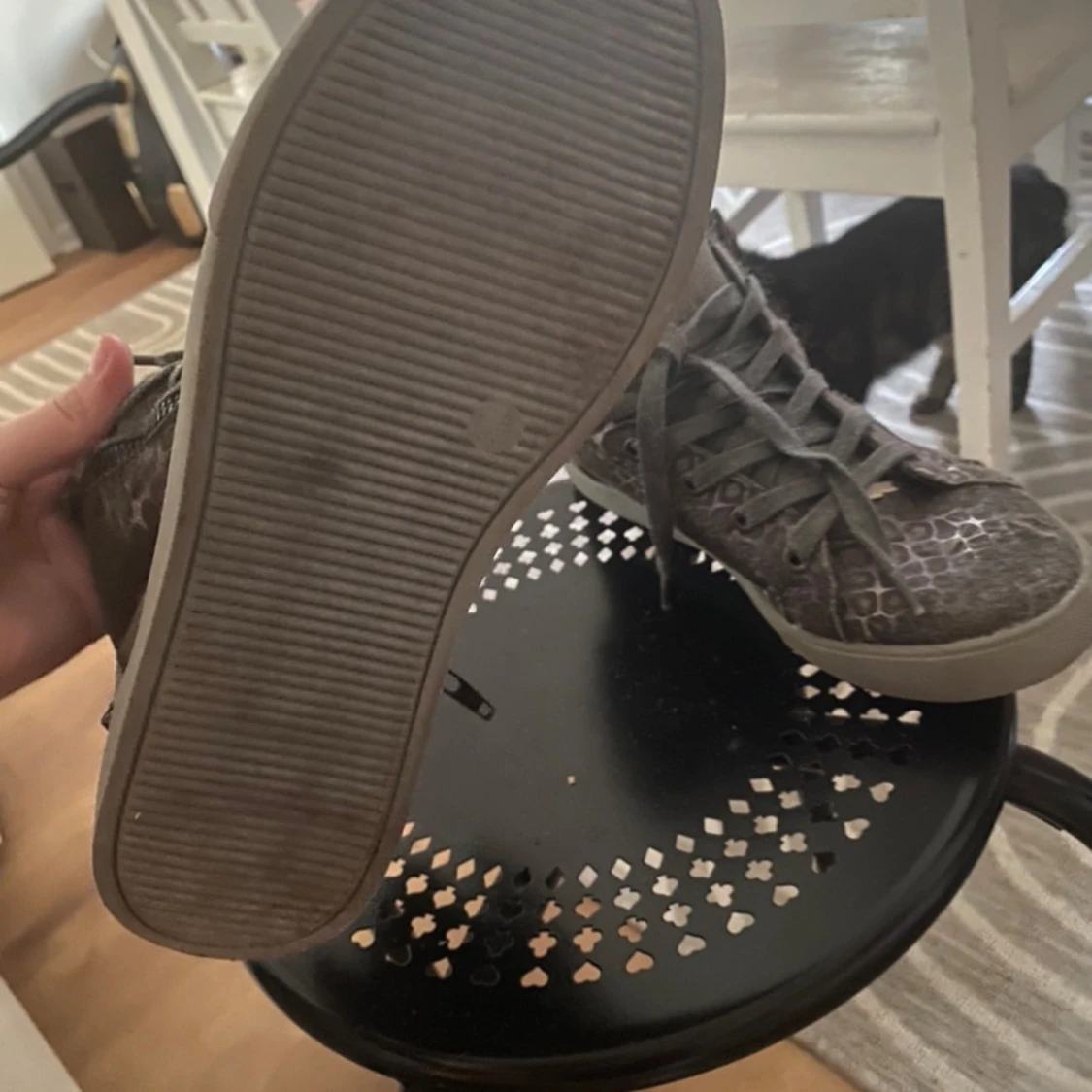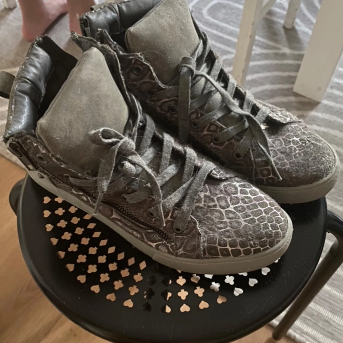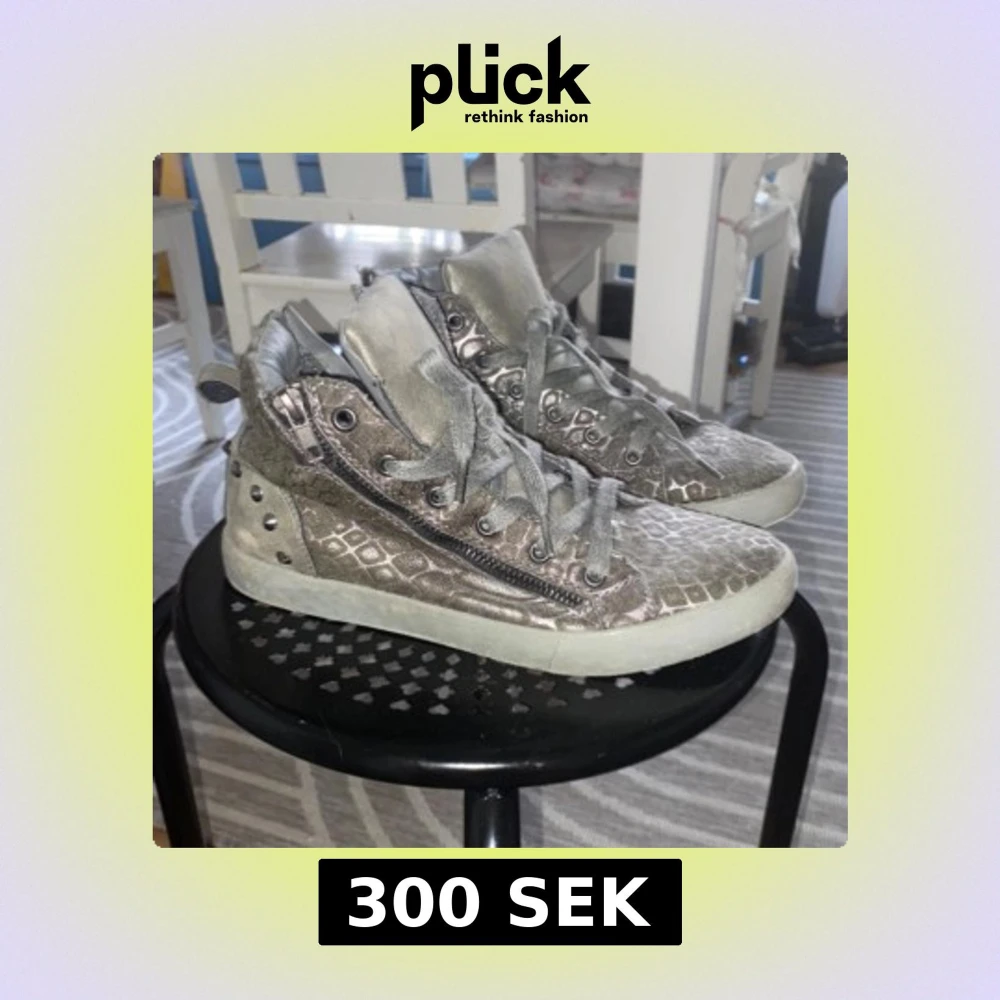 Unika silvriga sneakers med orm mönster och coola detaljer som dragkedja på sidan och snörning framtill. Skorna har en högre modell och platt sula, vilket ger en edgy look. Perfekta för dig som vill sticka ut med din stil.