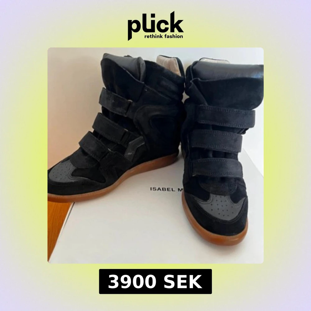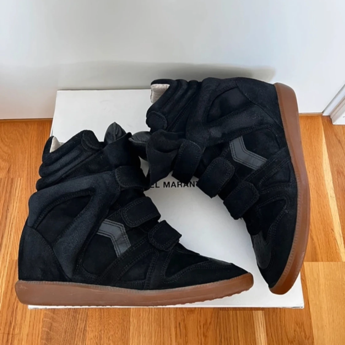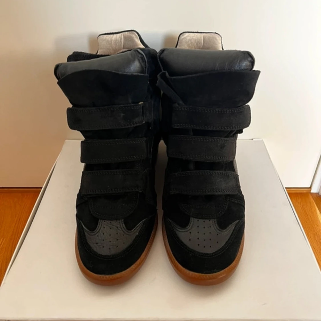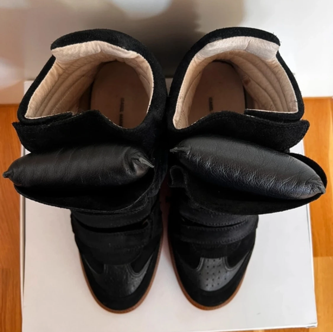 Svarta wedge sneakers från Isabel Marant med högt skaft och platt gummisula i brunt. Skorna har flera kardborreband, rund tå och är tillverkade i mocka och skinn. Den vadderade designen ger en cool och chunky look som sticker ut.Kan skicka mer bilder om det behövs 🥰❤️