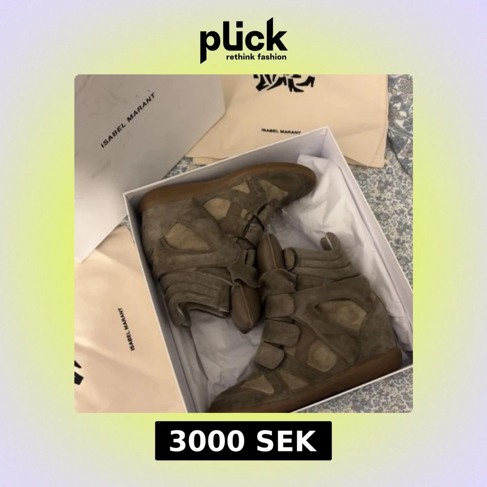 Säljer ett par ikoniska beige sneakers från Isabel Marant med kilklack och kardborreband. Skorna är i mocka och har en cool, sportig design med rund tå och platt gummisula. Perfekta för dig som vill ha både stil och komfort.