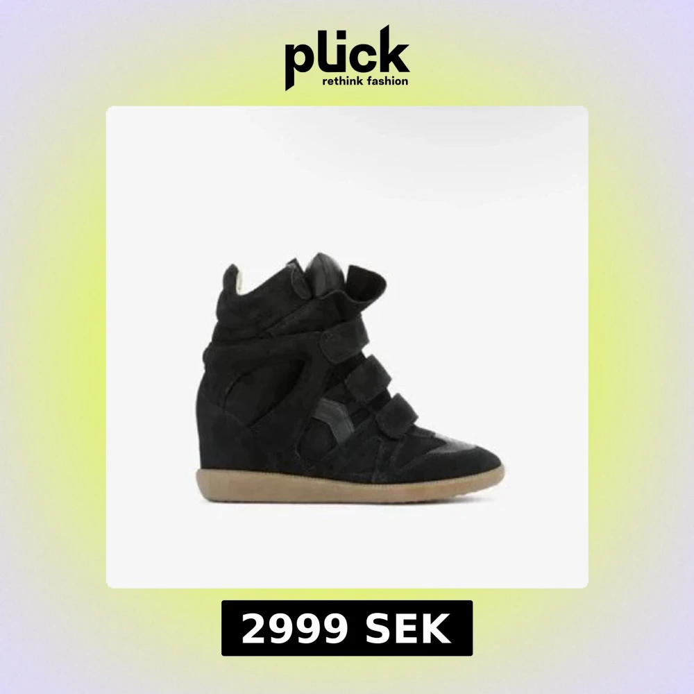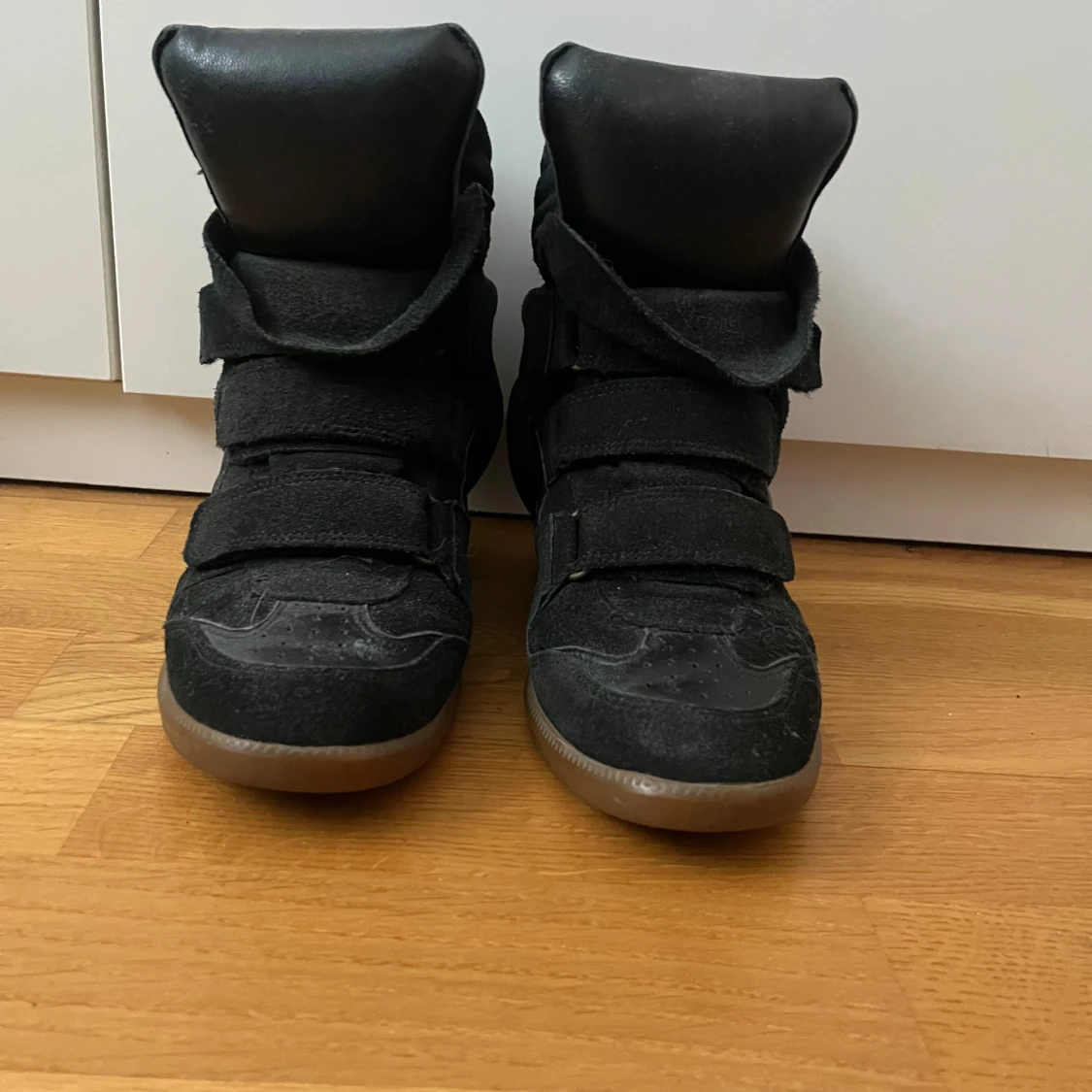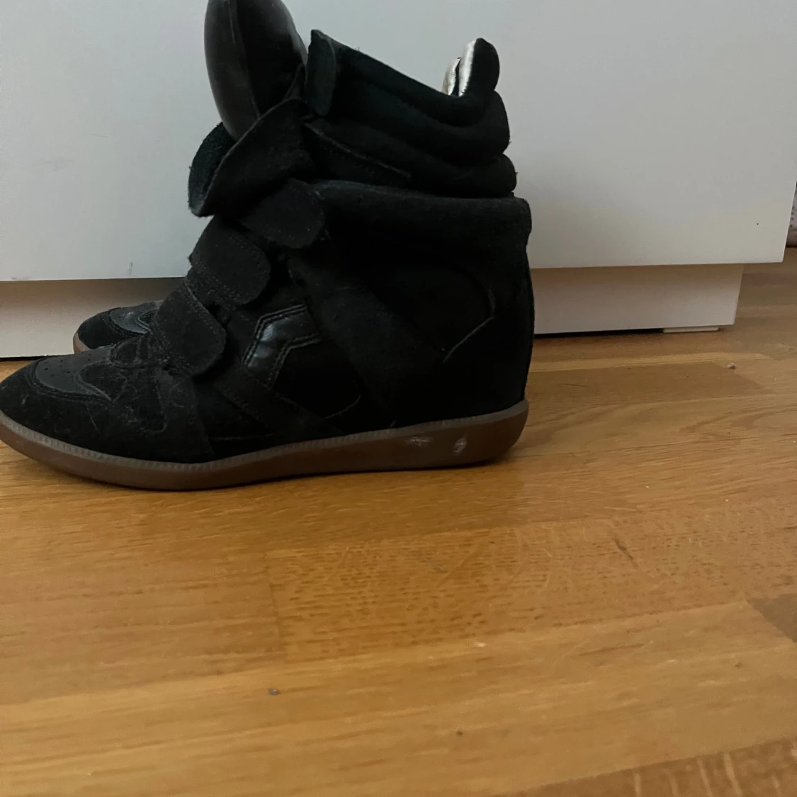 Säljer ett par svarta wedge sneakers med högt skaft och platt sula. Skorna har flera breda kardborreband över foten och är tillverkade i mocka och skinn. Yttersulan är beige och ger en snygg kontrast mot det svarta. Perfekt för dig som gillar streetstyle och vill ha lite extra höjd.