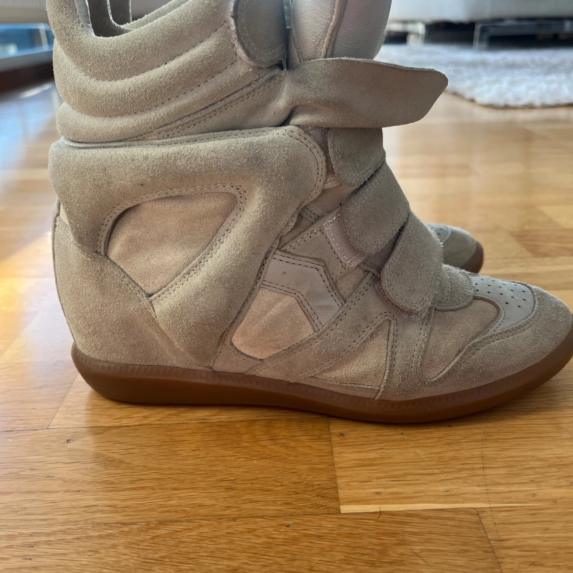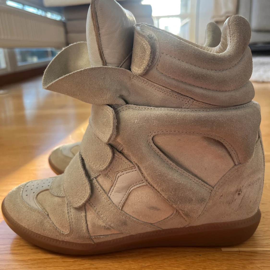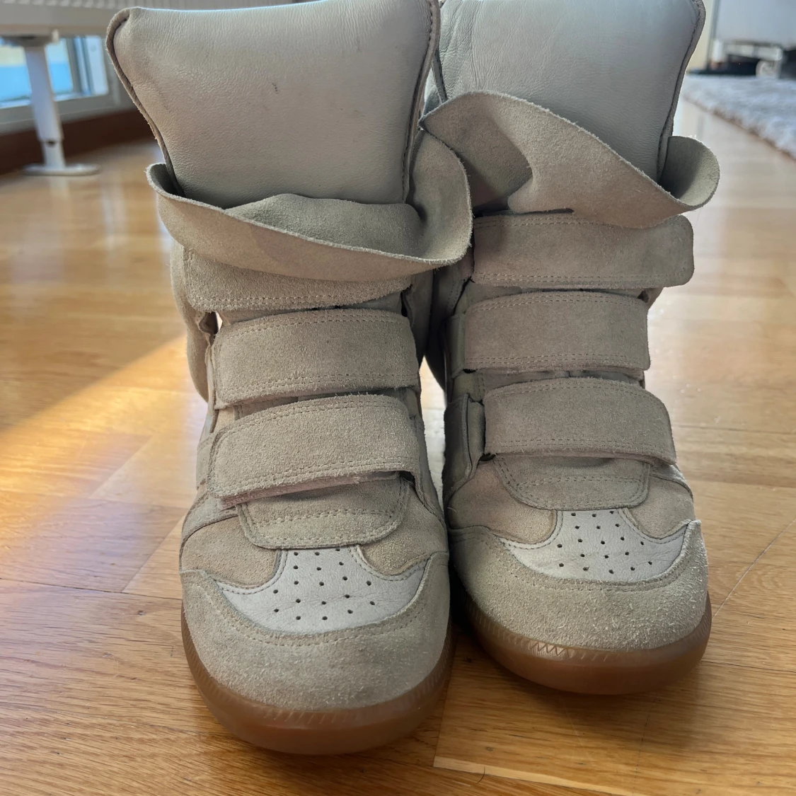 Säljer ett par beige wedge sneakers från Isabel Marant som är supersnygga. De är köpta här på plick så därav har har jag inget kvitto. Själv har jag bara använt de en gång så defekterna man ser på bilderna är från tidigare ägare. Fråga om fler bilder!! De är i storlek 39❤️