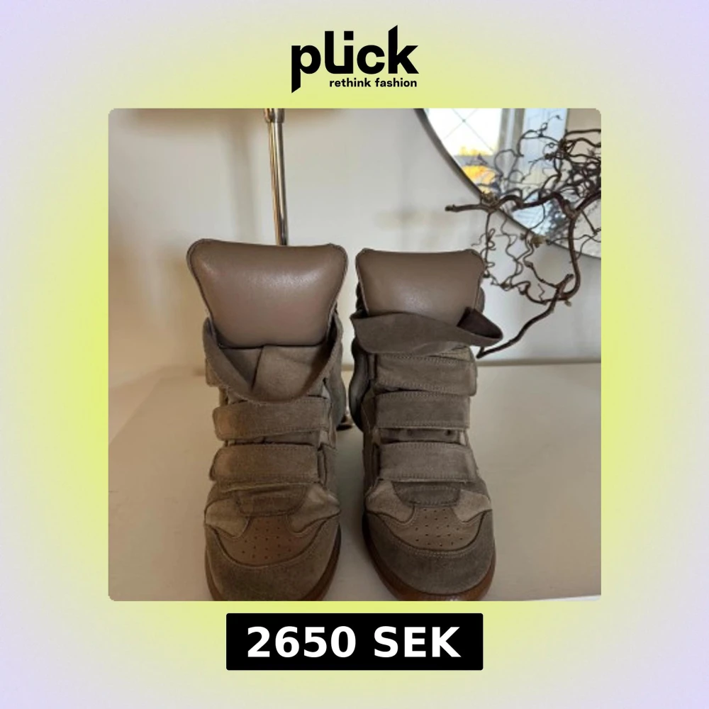 Säljer ett par chunky höga sneakers från Isabel Marant i beige mocka och skinn i storlek 39 men passar en 38.. Skorna har breda kardborreband, rund tå och en plattformssula. De har en unik design med extra vadderad plös och detaljer i olika nyanser av beige och brunt. Perfekta för dig som vill sticka ut med din stil. Kommer med ordinarie låda.