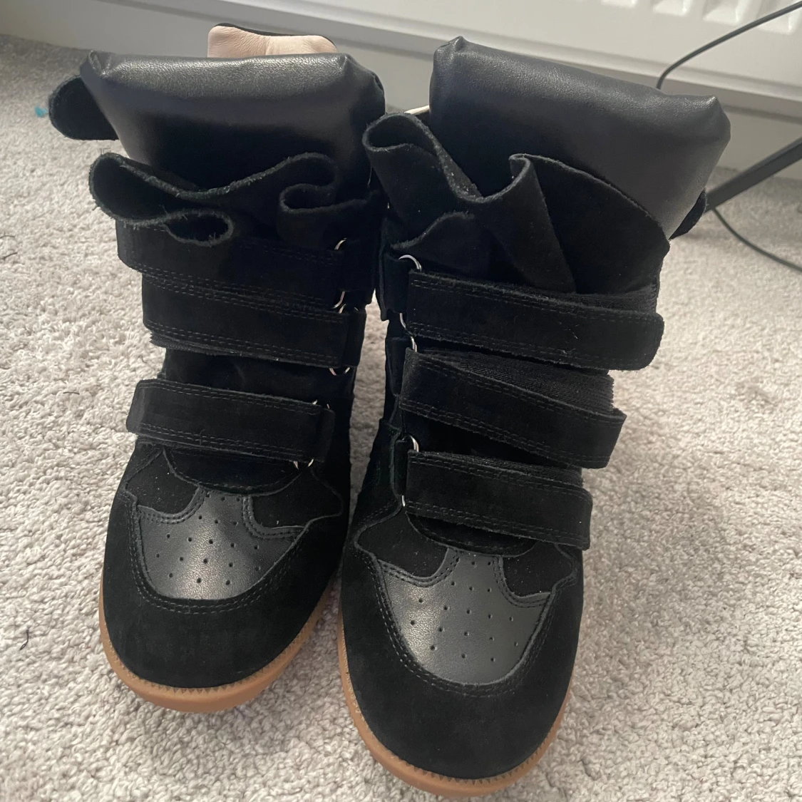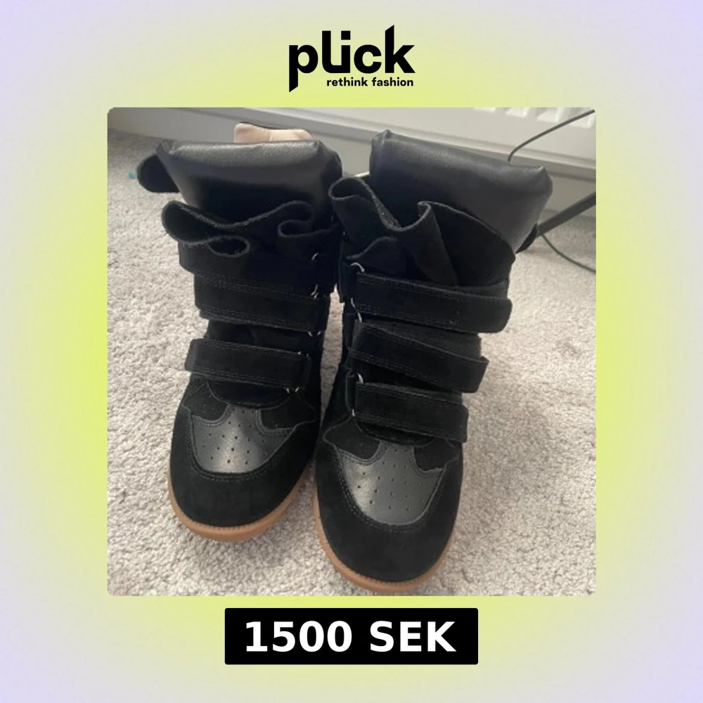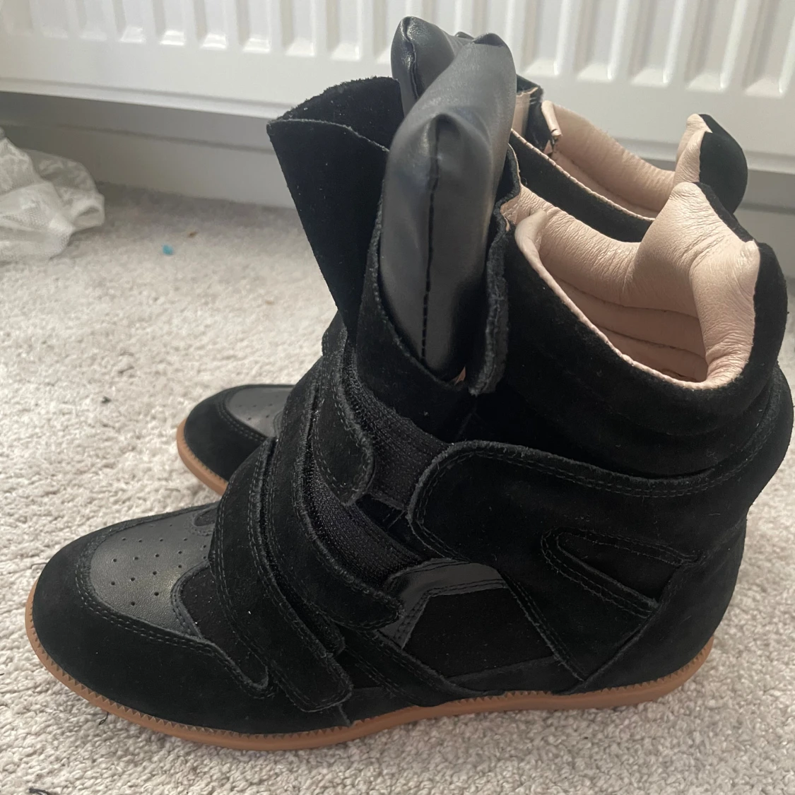 Säljer ett par svarta wedge sneakers från Isabel Marant med cool design och kardborreband. Skorna har en blandning av mocka och skinn, beige insida och brun gummisula.