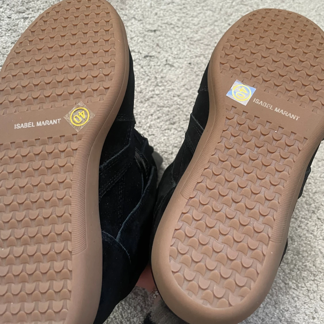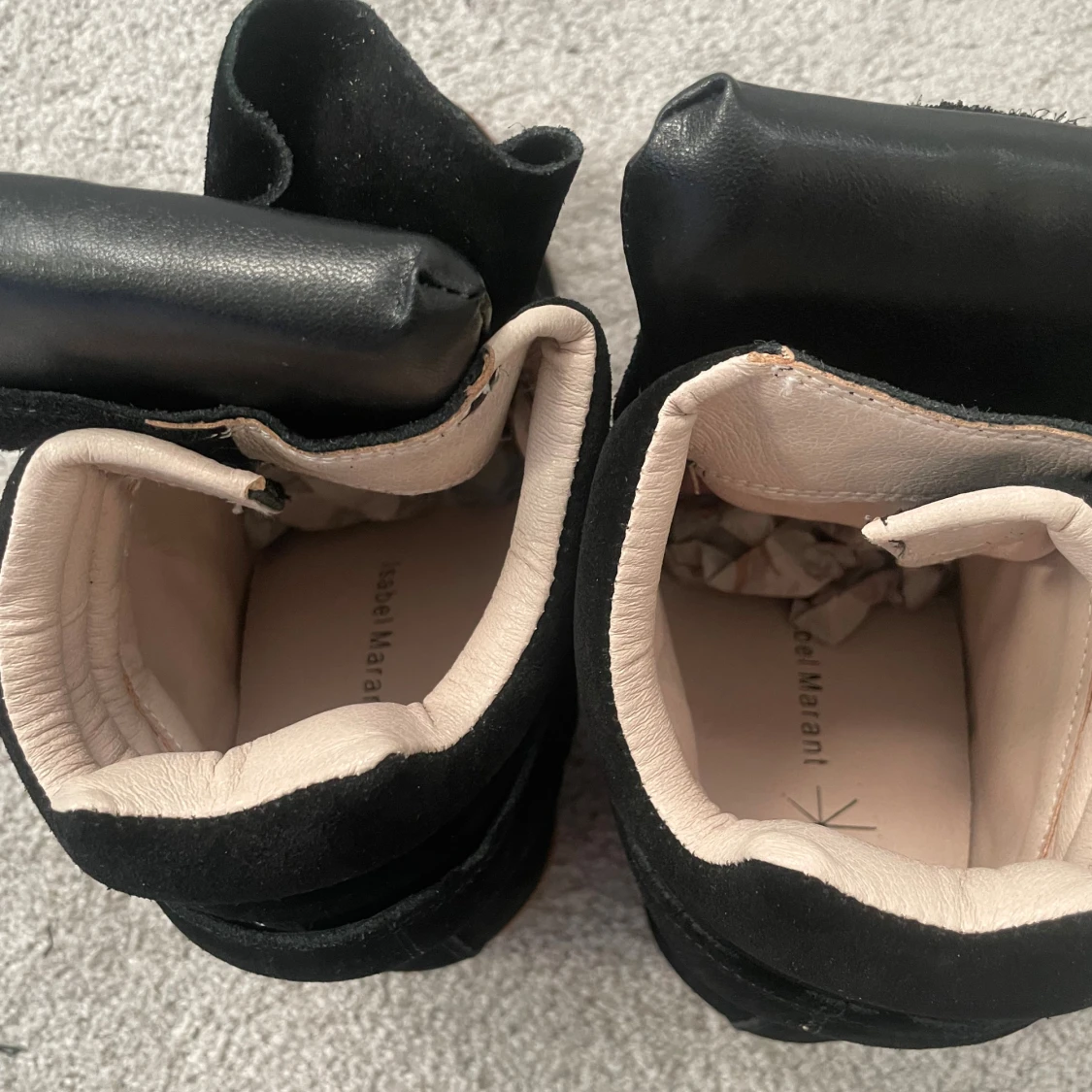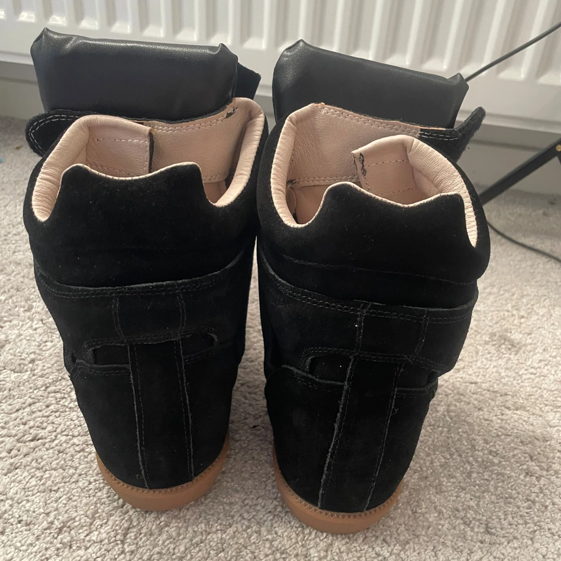 Säljer ett par svarta wedge sneakers från Isabel Marant med cool design och kardborreband. Skorna har en blandning av mocka och skinn, beige insida och brun gummisula.