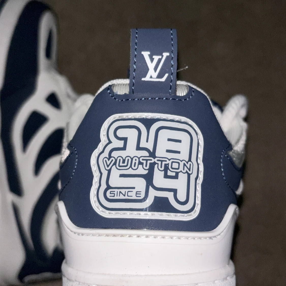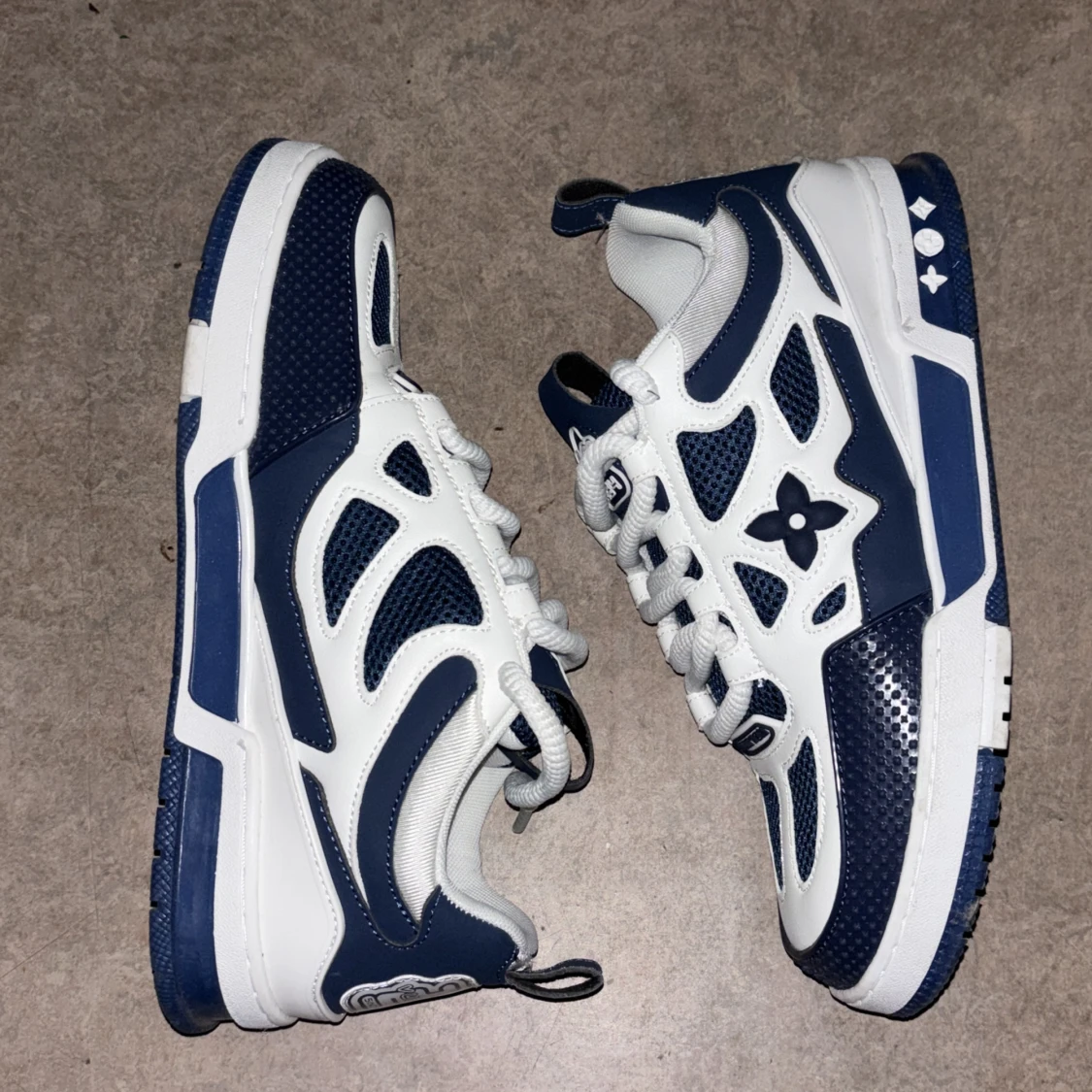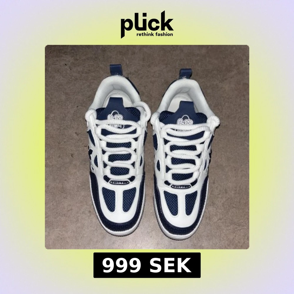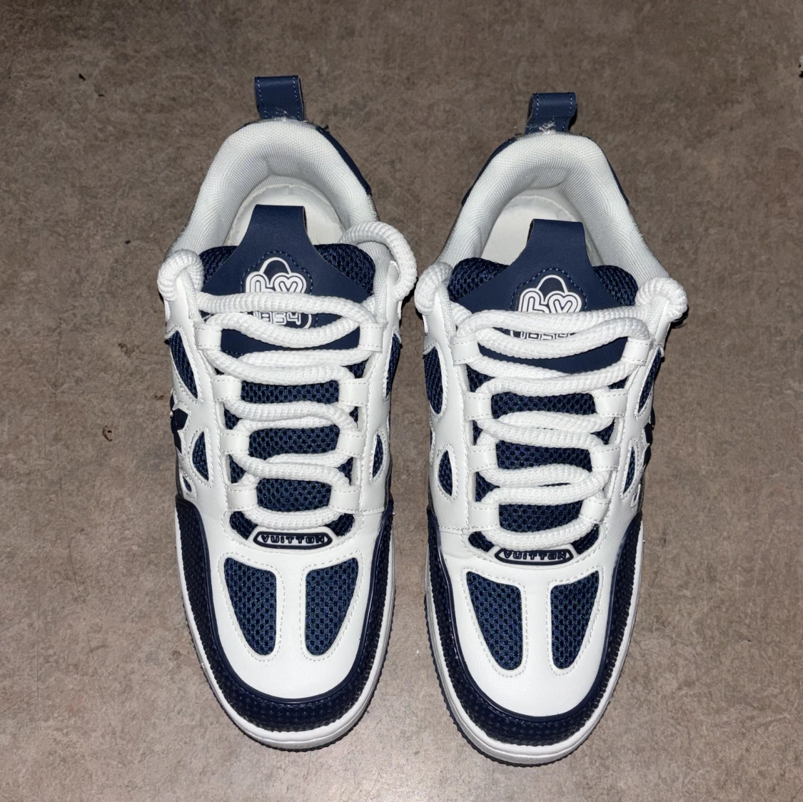 Säljer ett par sneakers i marinblått och vitt med coola detaljer och grafiska mönster på hälen. Skorna har snörning, rund tå och platt sula. Materialet är en mix av skinn och syntet med meshpaneler för extra ventilation. Perfekt för dig som gillar exklusiv streetstyle.