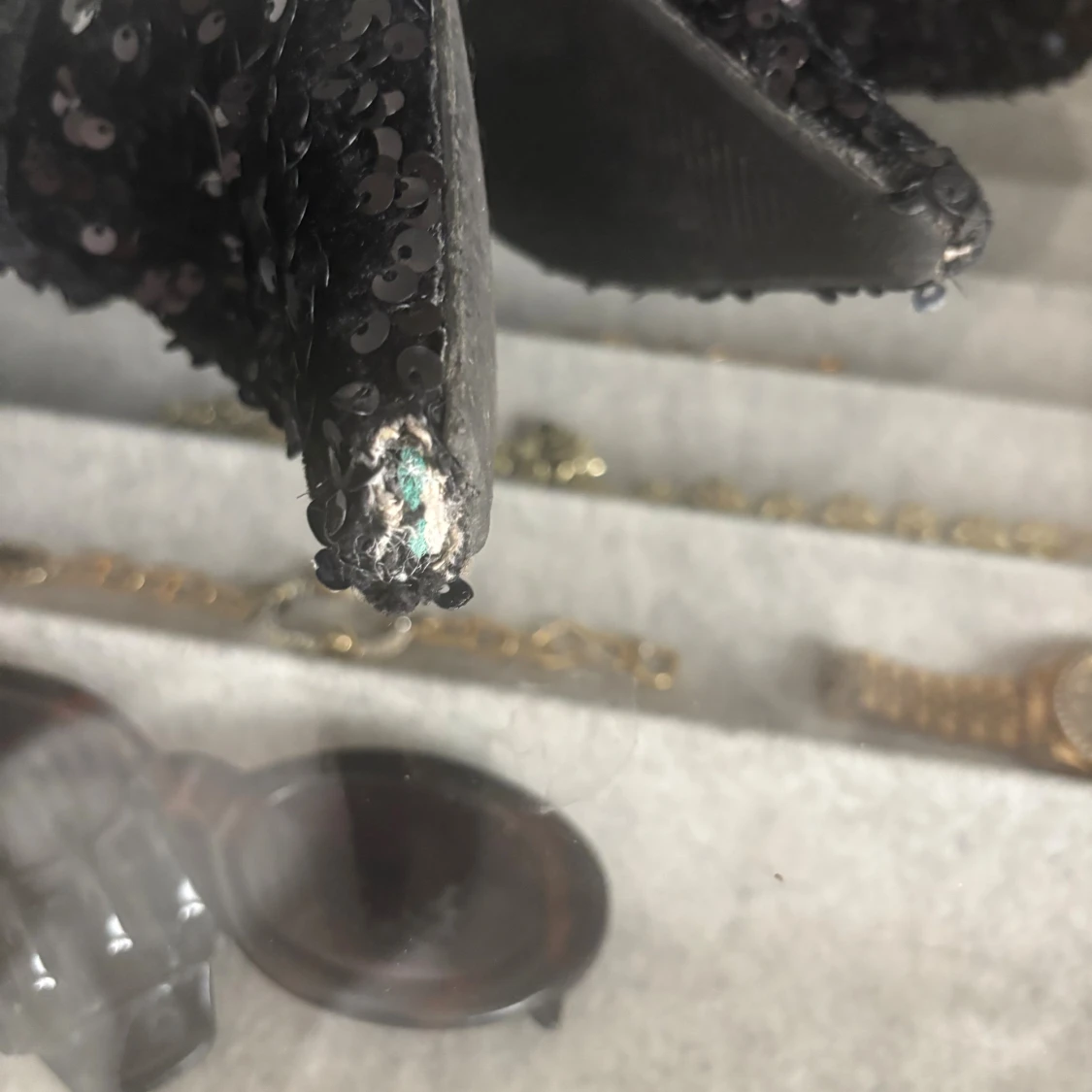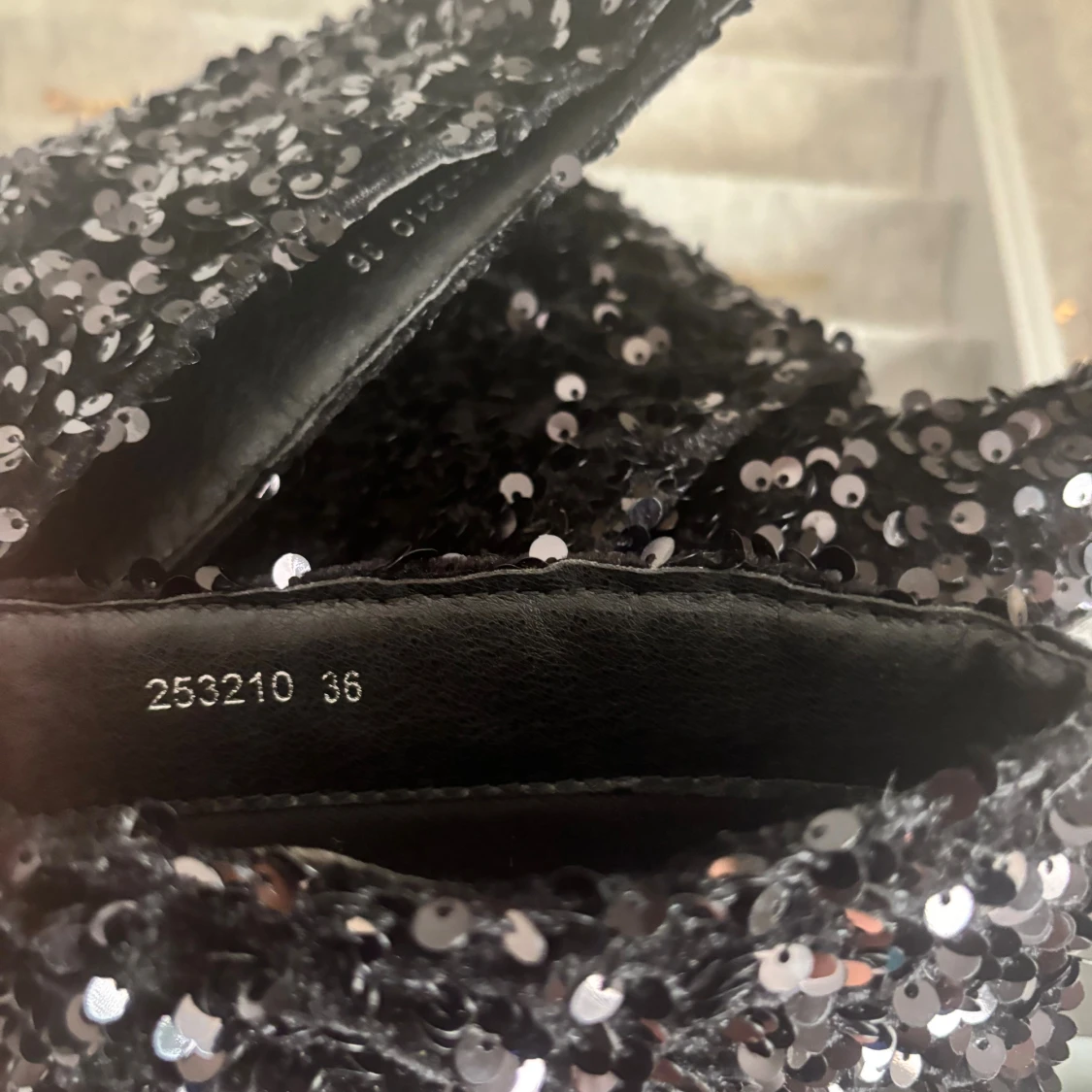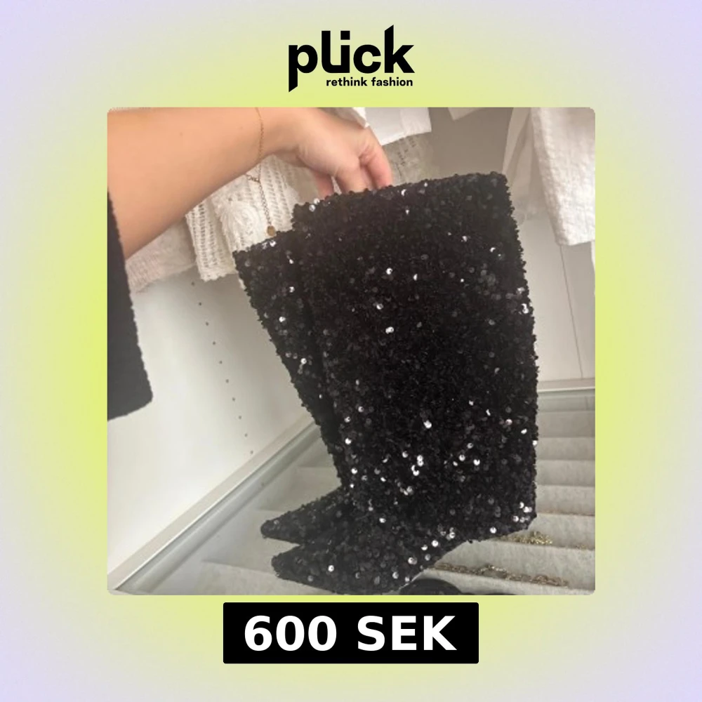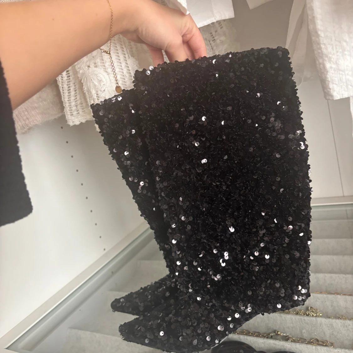 Unika svarta stövlar täckta i glittrande paljetter, med spetsig tå och hög modell. Perfekta för dig som vill sticka ut🫶🏽 ena skon är lite sliten i tåspetsen på bild 3🥰 annars är som super fina och sköna att gå i. Klacken är låg ca 2 cm🥰