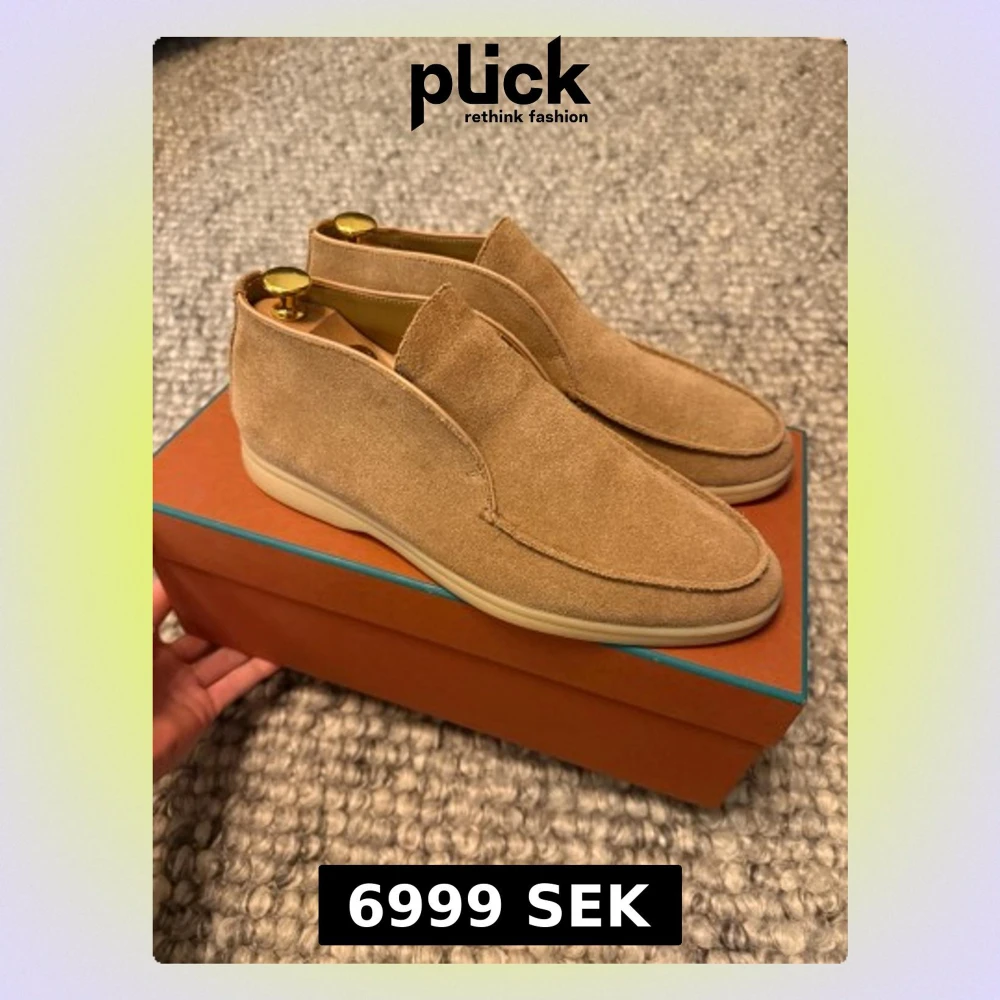 Säljer ett par open walks i beige mocka med rund tå och platt sula. Skorna har en enkel slip-on design utan snörning och en ljus yttersula som matchar den mjuka mockan. Perfekta för dig som gillar en clean och avslappnad look.