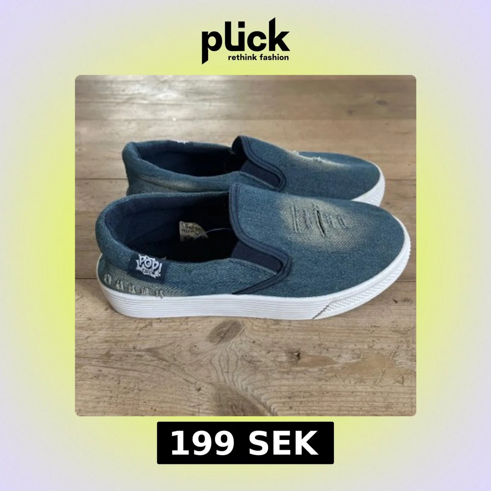 Säljer ett par jeansblå slip-on sneakers från Pop Café med vit platt sula och slitna detaljer framtill. Skorna har elastiska sidor för enkel påtagning och är tillverkade i jeansmaterial. Perfekta för en avslappnad stil.