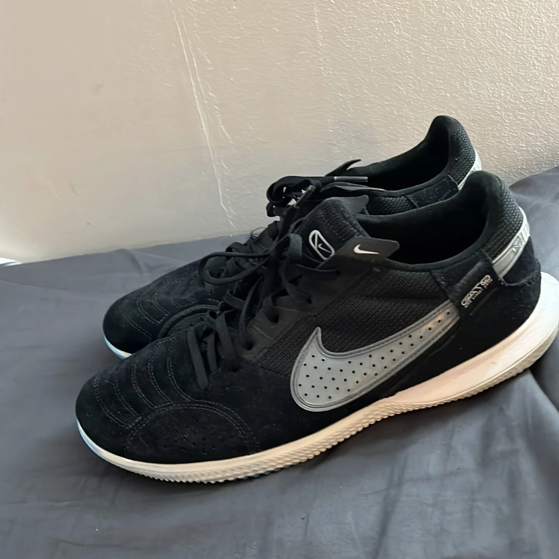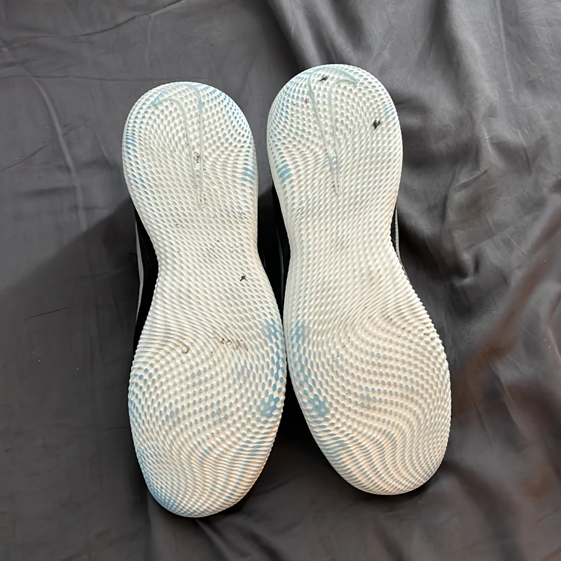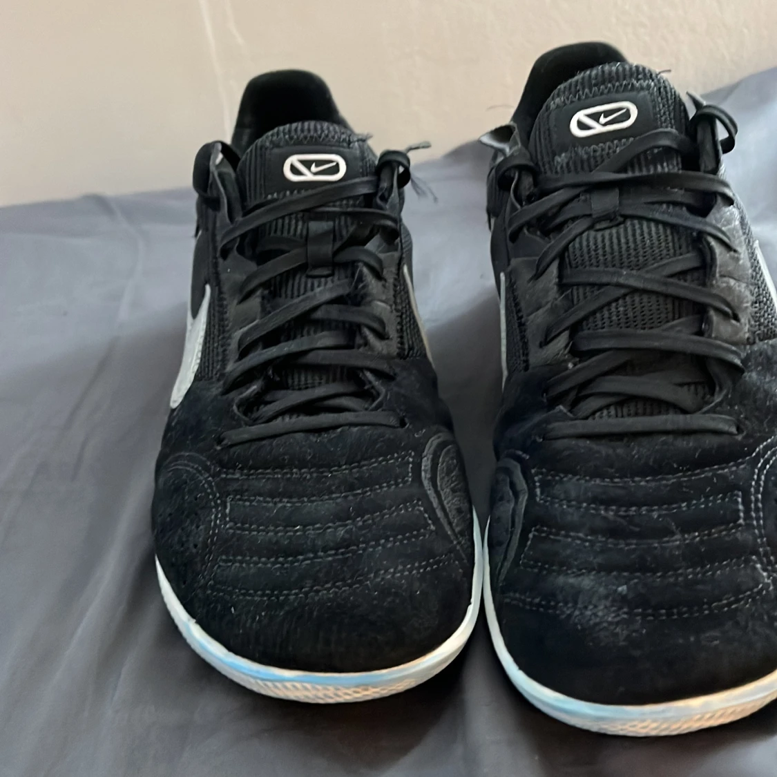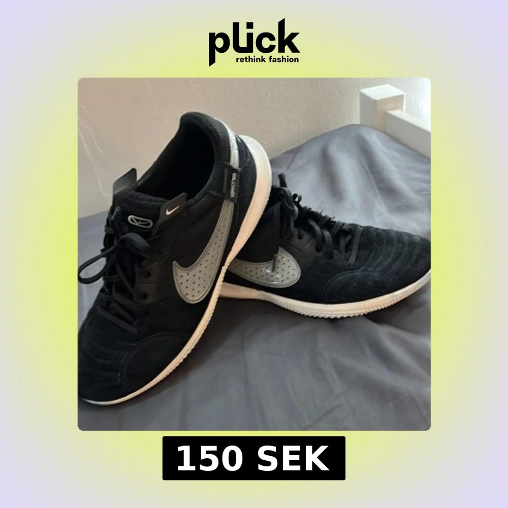 Ett par riktigt fet Joga bonito futsal skor i en svart i vit farkombo. Har ett fantastiskt grepp på planen i o många olika material för maximerad grepp . Säljer för de e för små. Inga slitningar förutom att lite av den blå futsalplanen jag spelade på förut har färgat av sig lite på sulan. Nypris 900