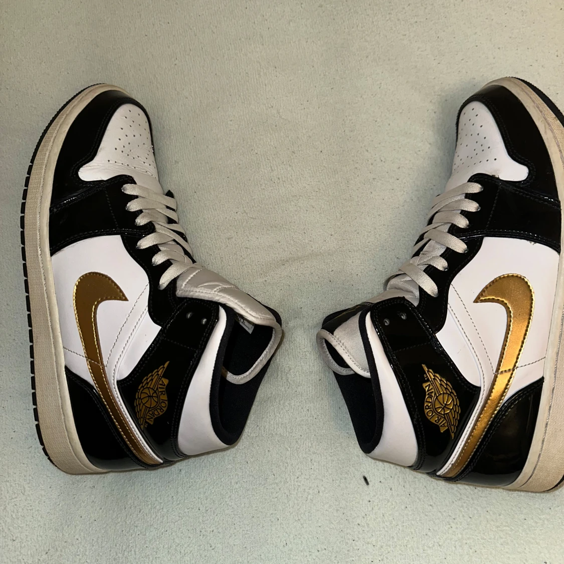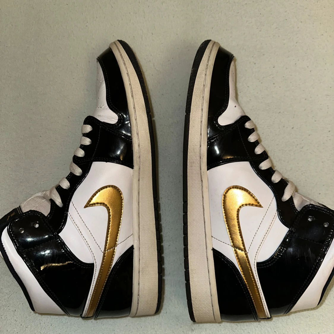 Snygga Nike Air Jordans i svart, vitt och guld med klassisk snörning. Skorna har en iögonfallande guldfärgad swoosh och detaljer på sidan. Perfekta för den som vill ha en stilren och sportig look.