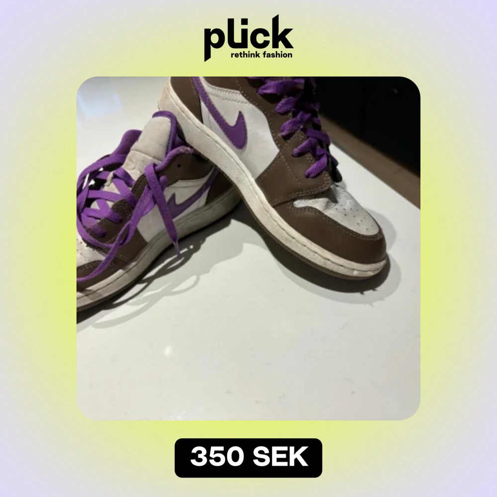 Det är ett par air jordan 1 low de är i gott skick, de är brän Märke som man inte tänker på när man har på sig de. Märket är på den högra skon. De är använda många gånger. De kan behöva bytta snören på de för de är också ganska slitna. Fg brun, lila