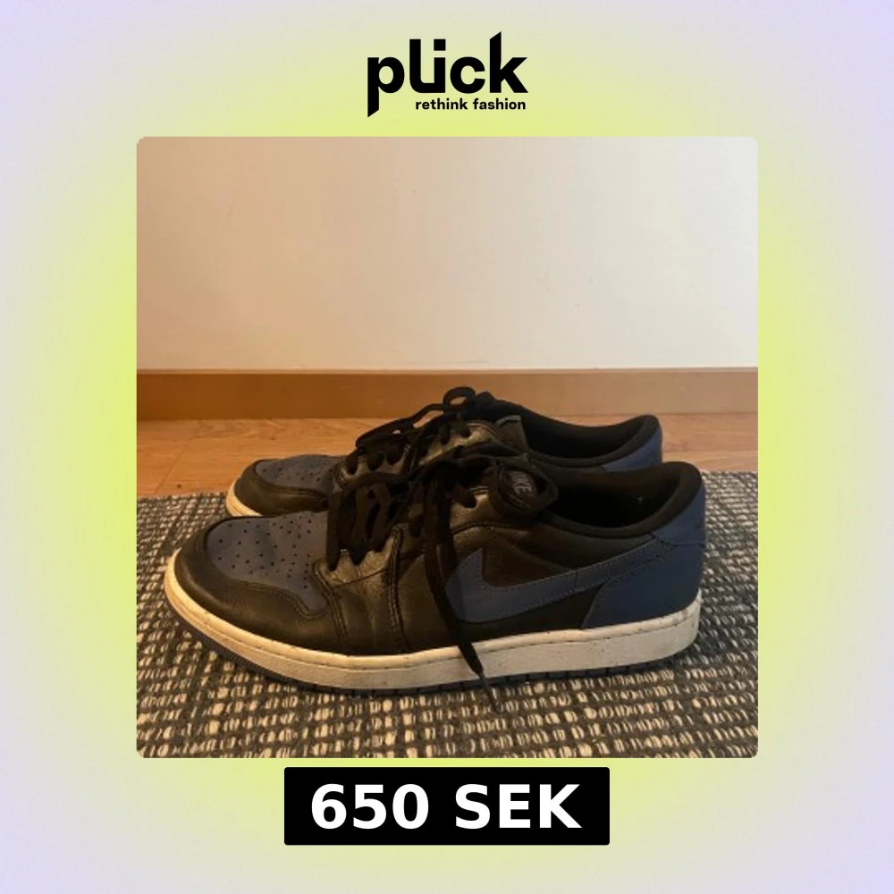 Säljer ett par Nike Air Jordans Low i svart och mörkblått med klassisk swoosh på sidan. Skorna har snörning, rund tå och platt vit sula. Perfekta för dig som gillar streetwear och vill ha en ikonisk sneaker i garderoben.