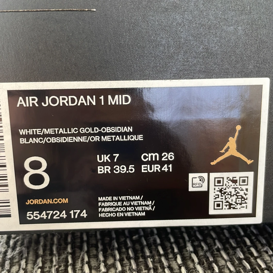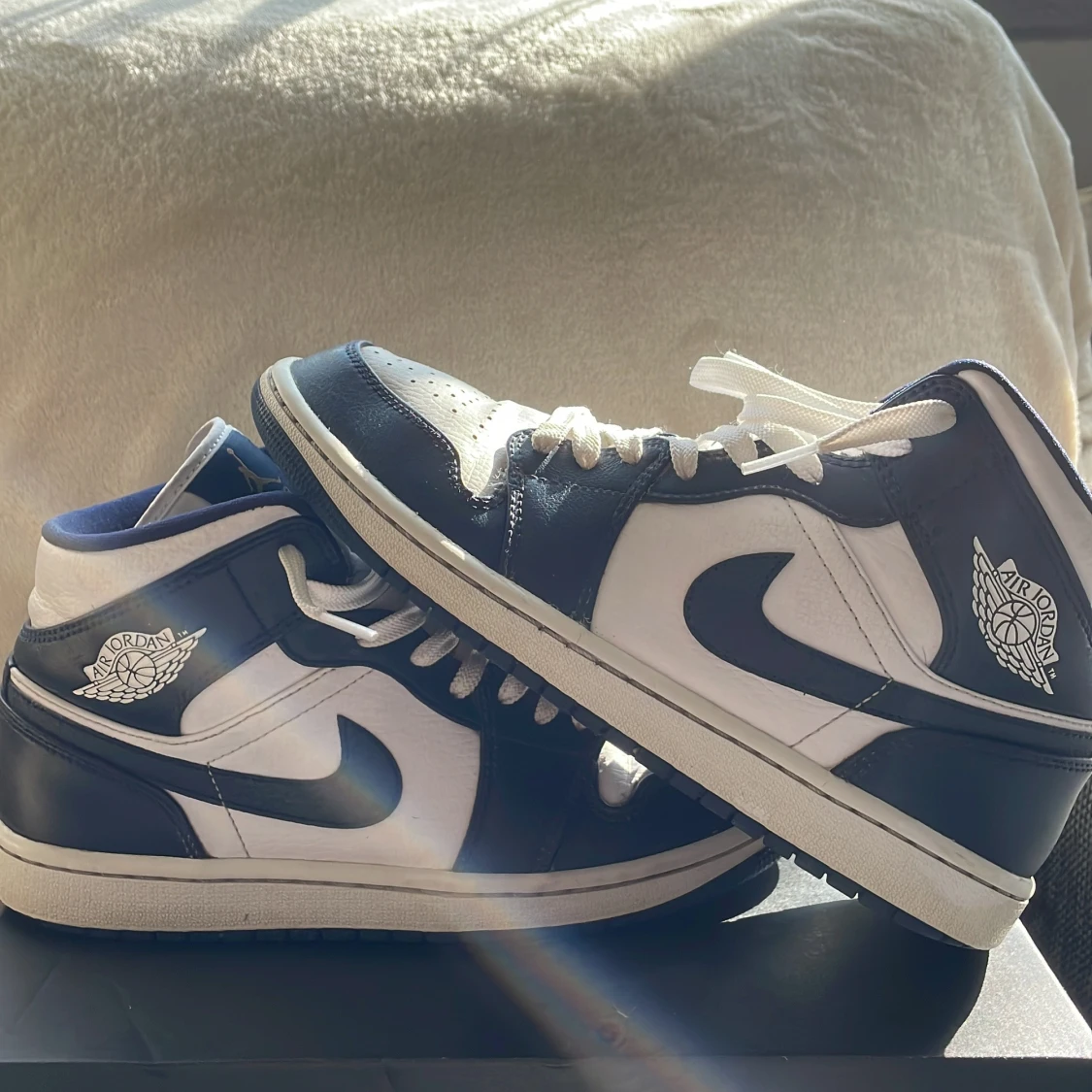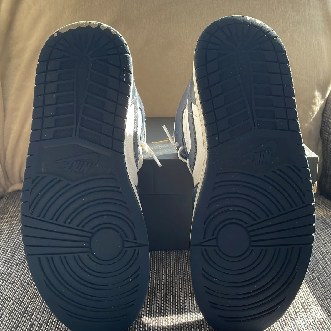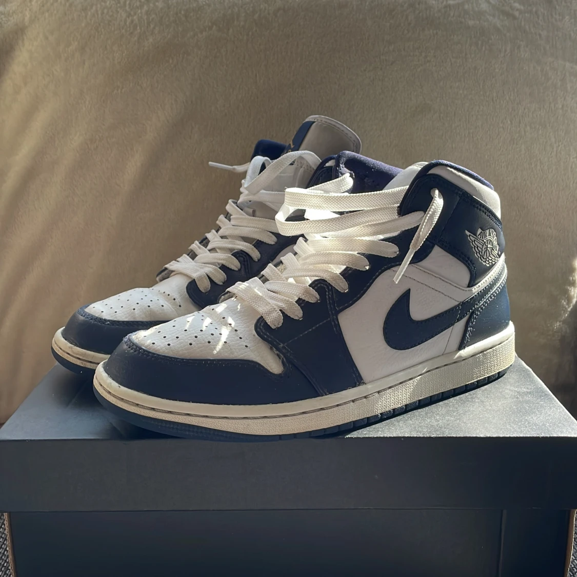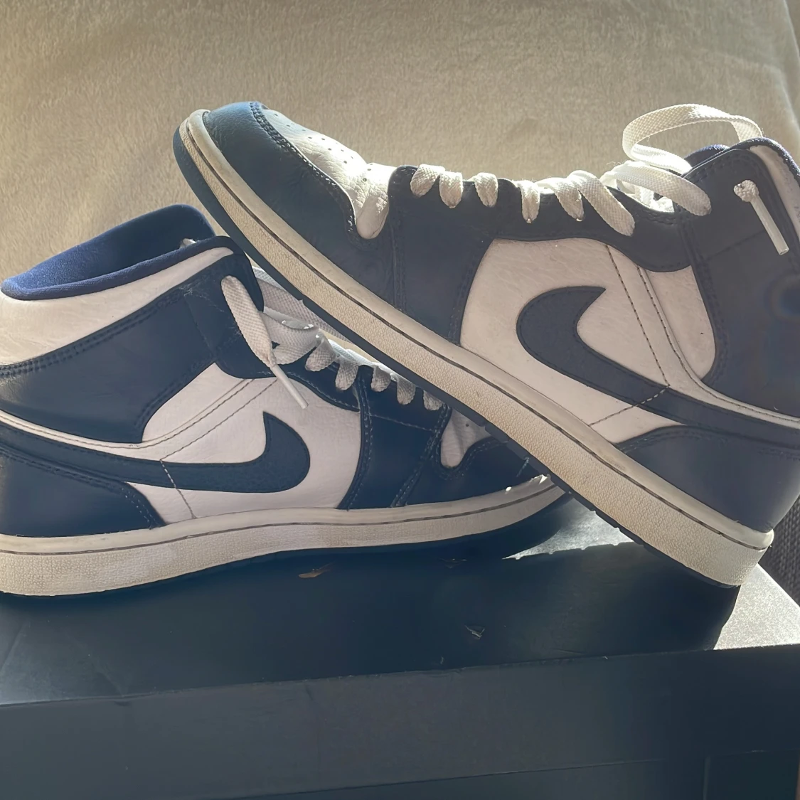 Jordan 1 mid som är helt okej skick 6/10 lite slitna och under skon som man ser på bild 2. Köpte på Zalando för ca 1300-1400kr. Ganska mörk ton av blå.