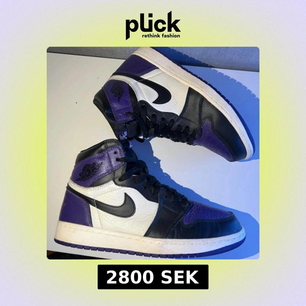 Säljer ett par Nike Air Jordan 1 Court Purple high. Skorna har en snygg färgkombo av lila, svart och vitt i äkta skinn. Perfekta för dig som vill sticka ut med en ikonisk sneaker. Köpt för två år sedan för 7400. Använda fåtal gånger, cond 9/10