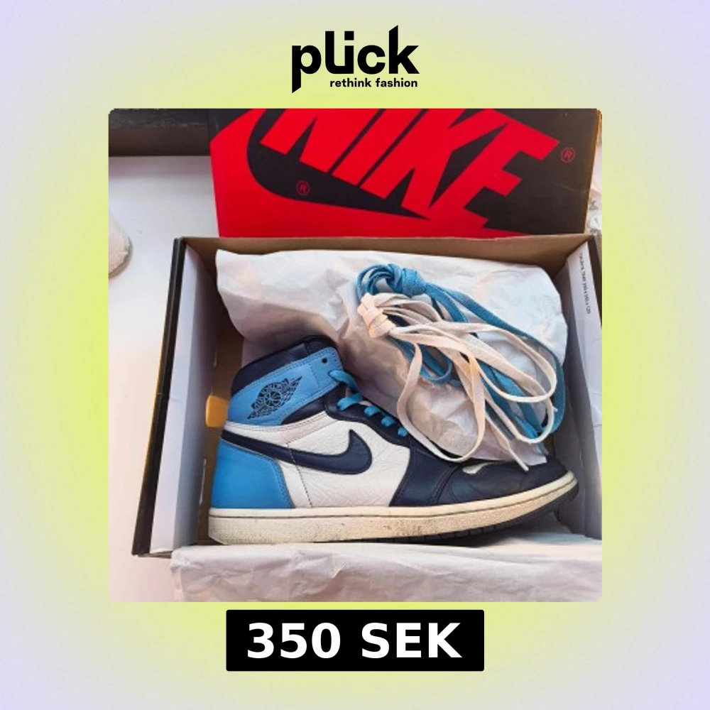 Air Jordan 1 Retro High OG Obsidian i storlek 44, säljes i använt skick med slitningar på hälen (se bilder). Originalkartong och extra skosnören ingår. Populär och eftertraktad färgkombination för dig som vill ha ett par äkta Jordans till bra pris.