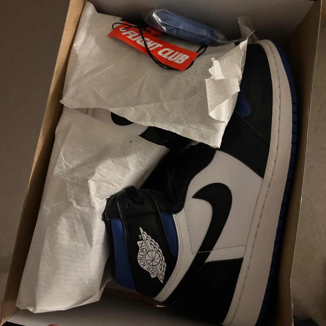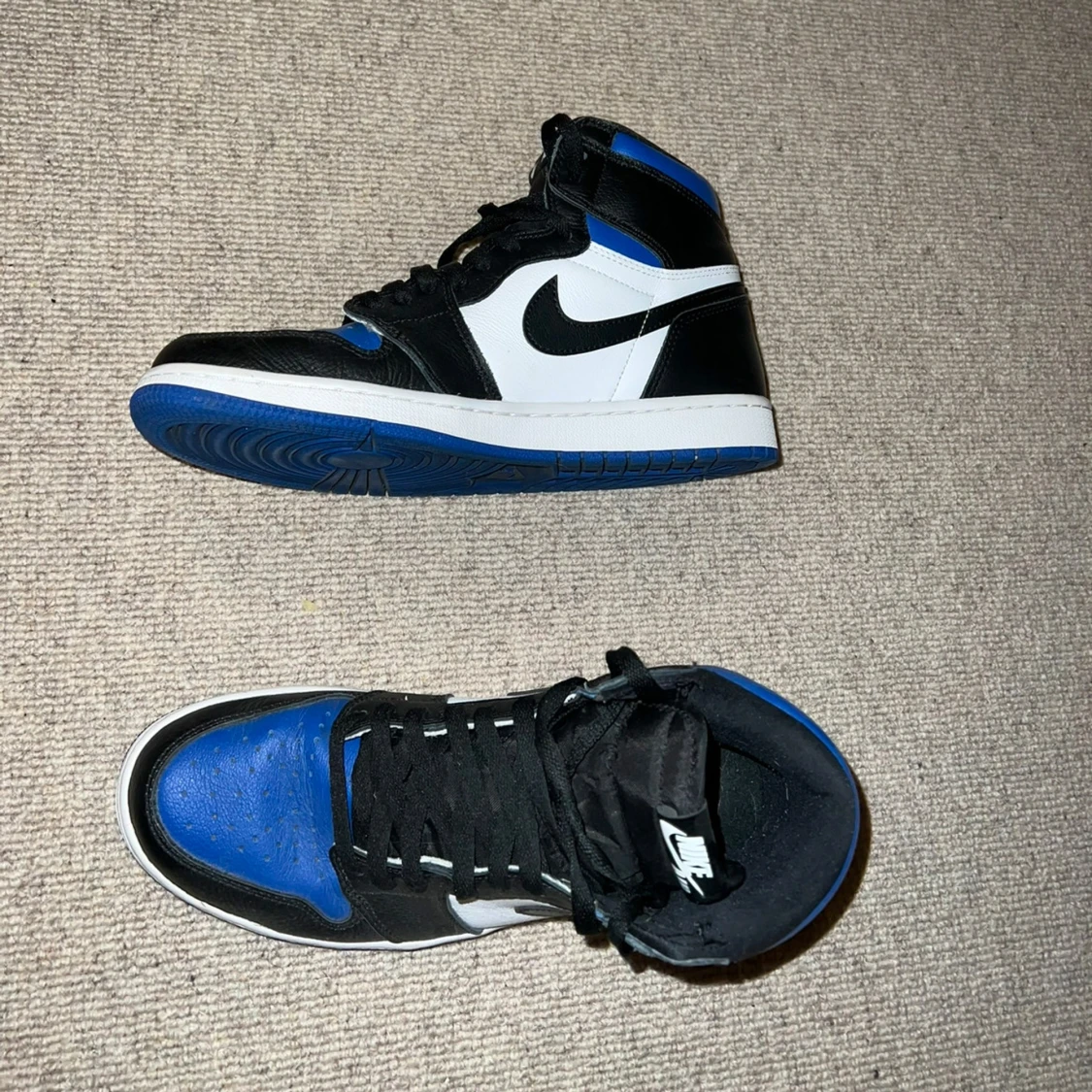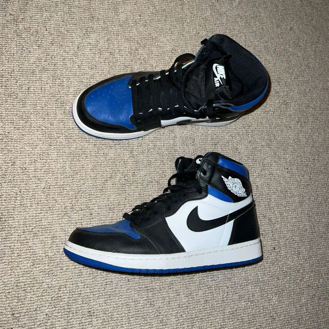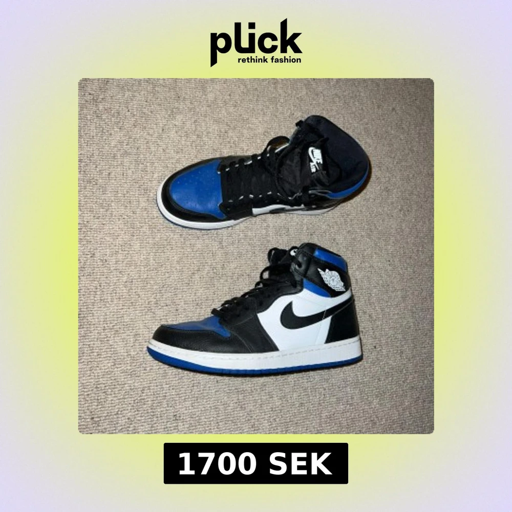 Säljer ett par Nike Air Jordan 1 Retro High OG Royal Toe. Skorna har svart, vit och blå färg med klassisk Jordan-logga på sidan och svart swoosh. Medföljer extra blå skosnören och originalbox.