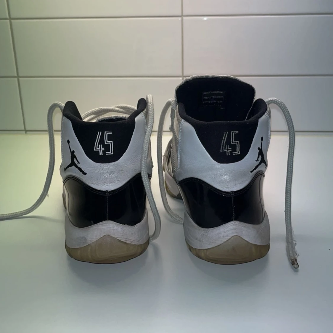 Jag säljer mina jordans för de är lite för små. De är i storlek 45. Pris: 500 kr Det är en använd sko men den går för 6500 ny på stockx