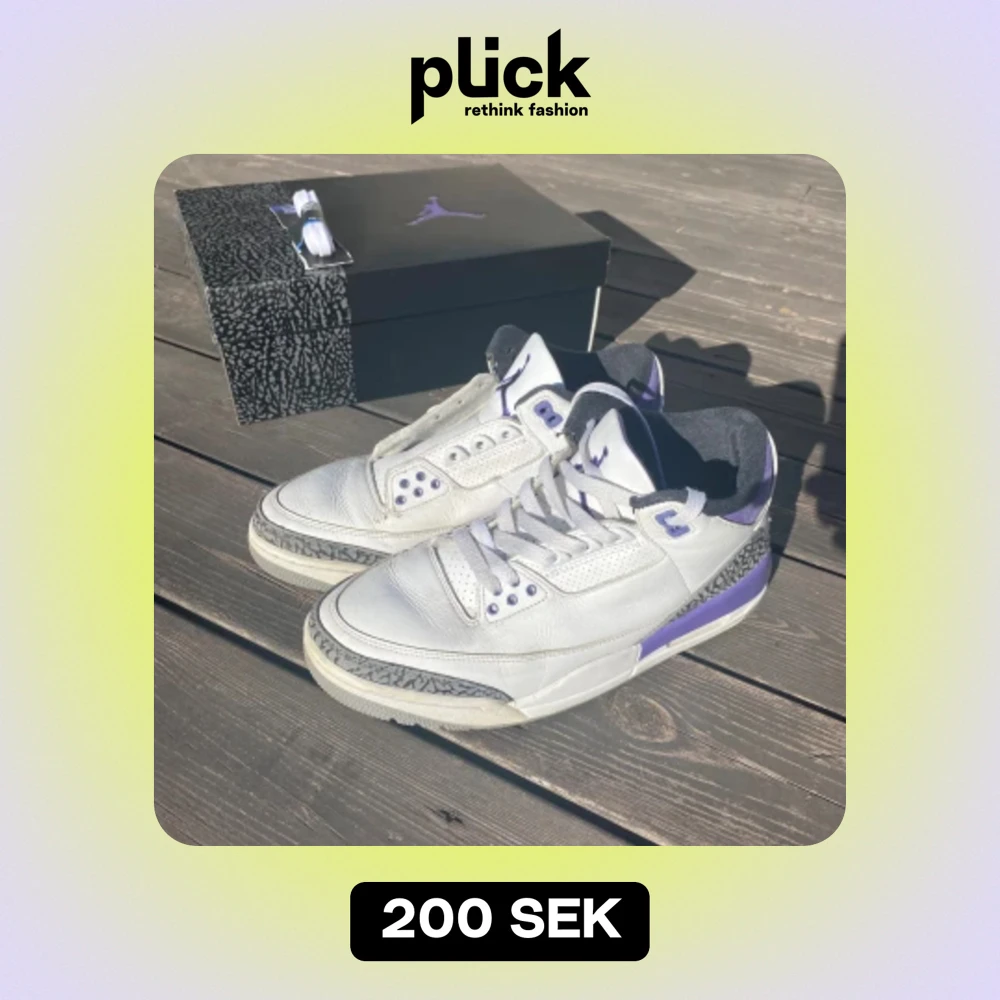 Jordan 3 dark iris i storlek 43. Köpta från SNKRS appen. Man får med helt nya snören och skolådan. Dom är välanvända därför lågt pris. Det är även hål i på insidan i hälkappan, se sista bilden. Nypris 2249 säljer för 200