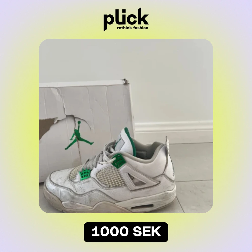 Säljer Jordan 4 metallic green i använt skick. De är ganska slitna och därför säljer jag för billigt pris. 1000kr storlek 43.