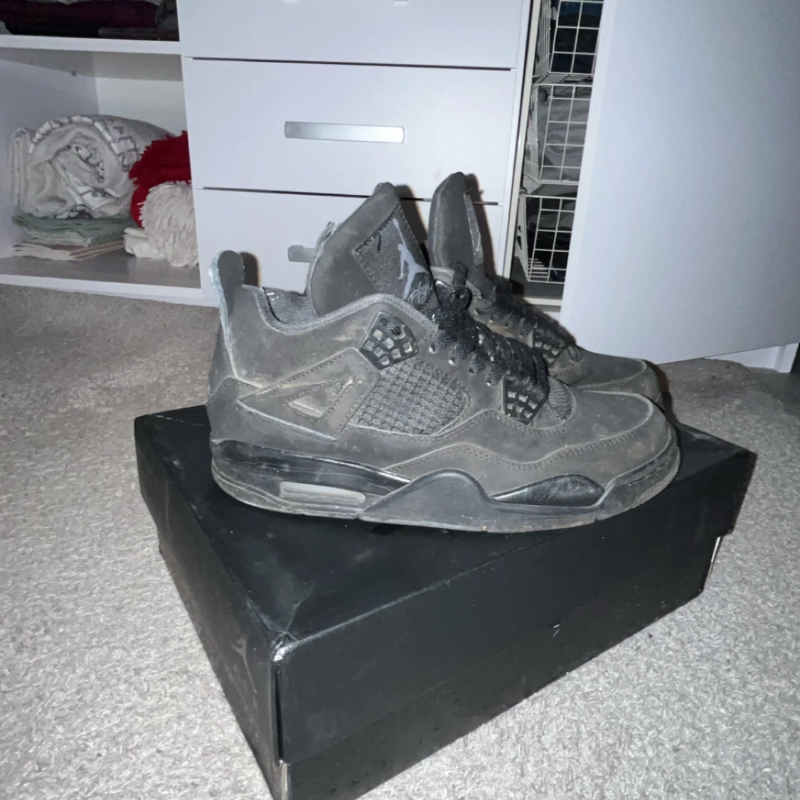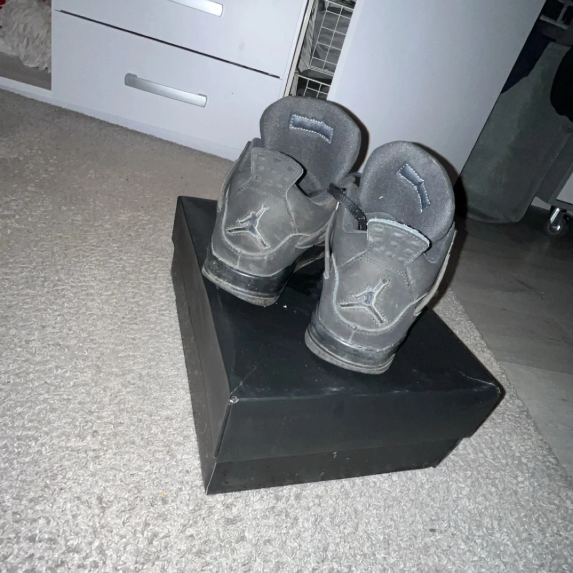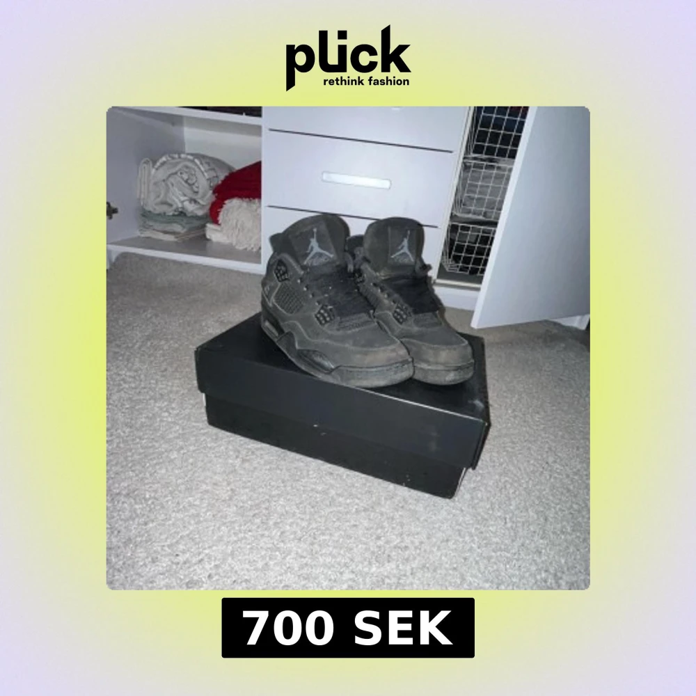 Tjena, säljer ett par jordan 4 black cats. Anledningen till att jag säljer skorna är för att de ej kommer till användning och ligger bara i garderoben. Skorna är i använt skick men det är enkelt att tvätta. Det är en tidlös sko som är enkel att matcha o trendiga. Man får med box på köp, skriv för fler frågor eller bilder. Önskar er allt gott//Kevin