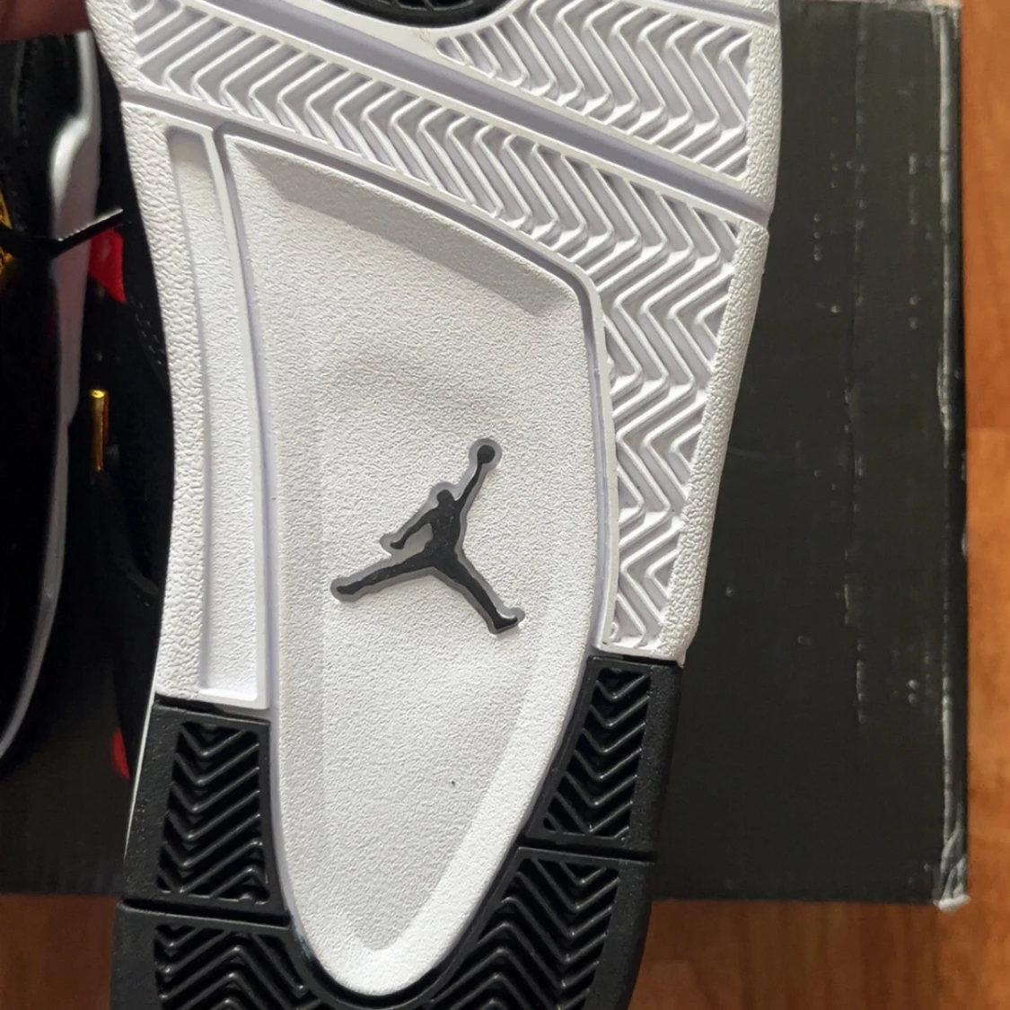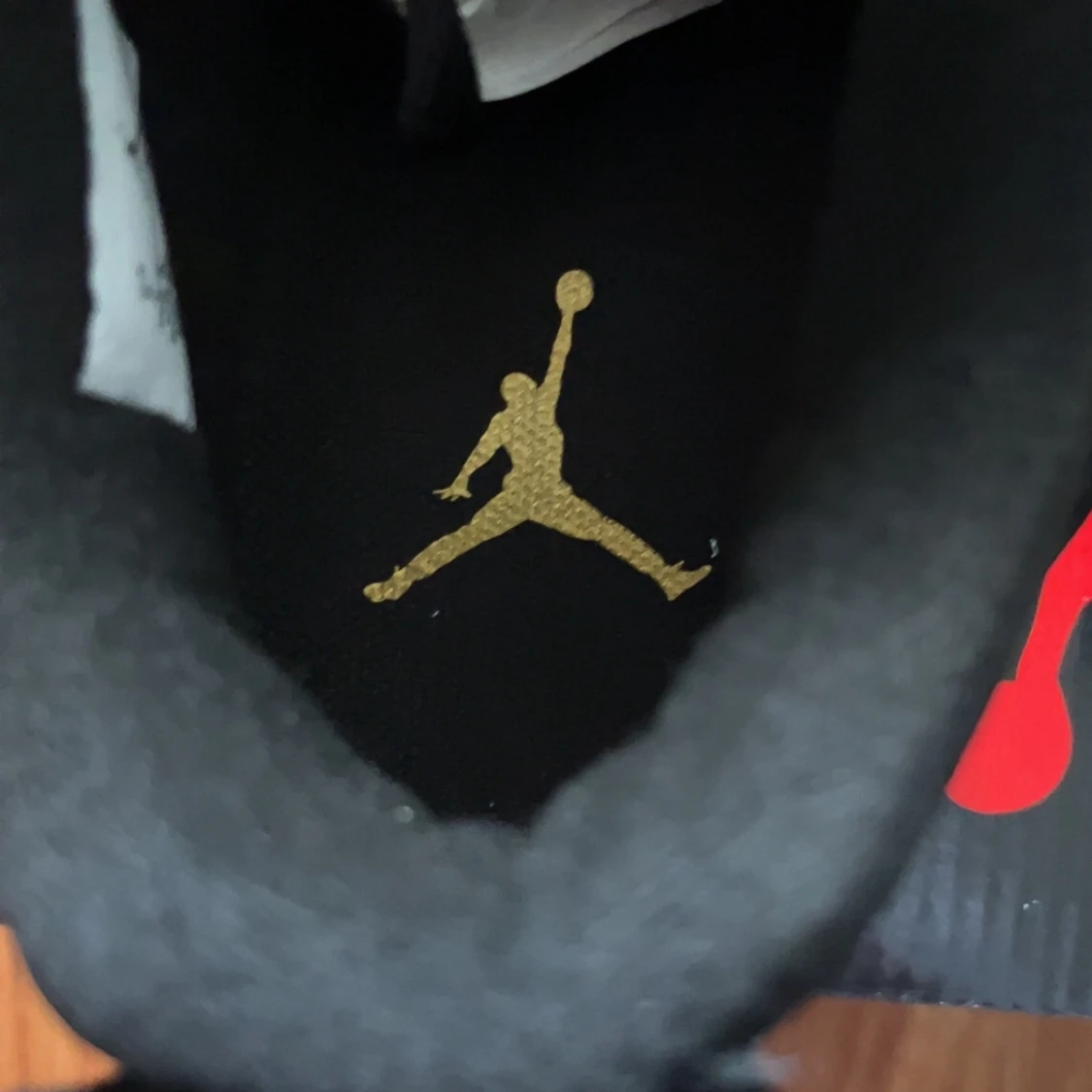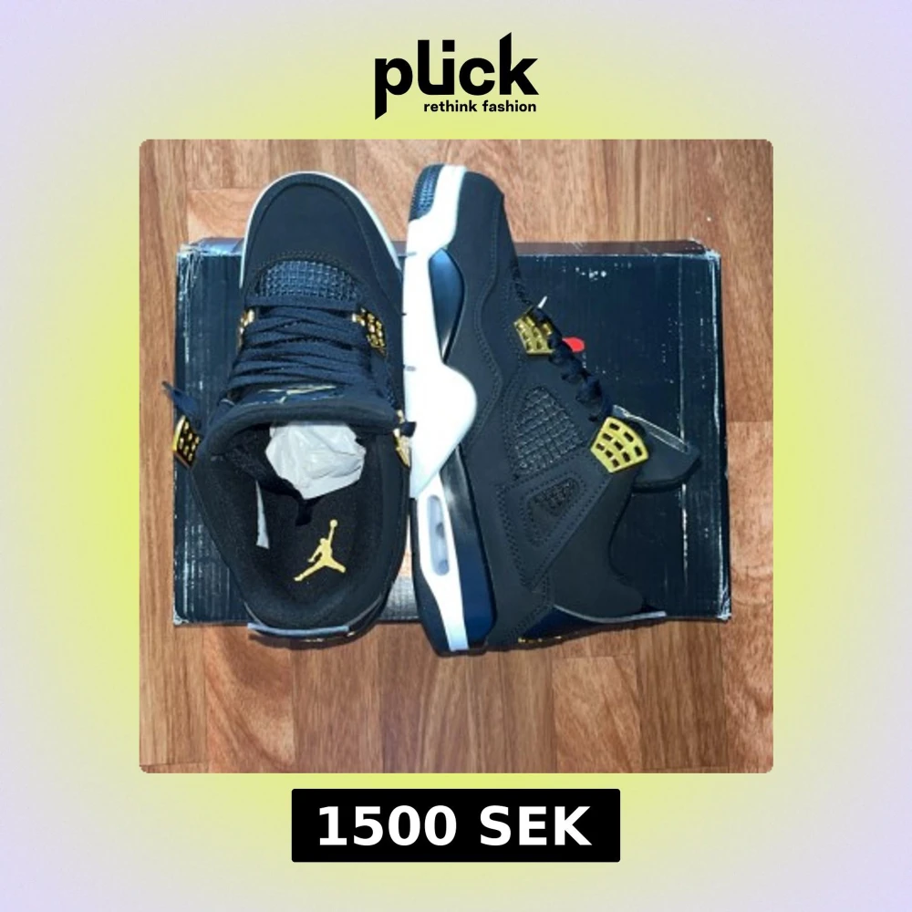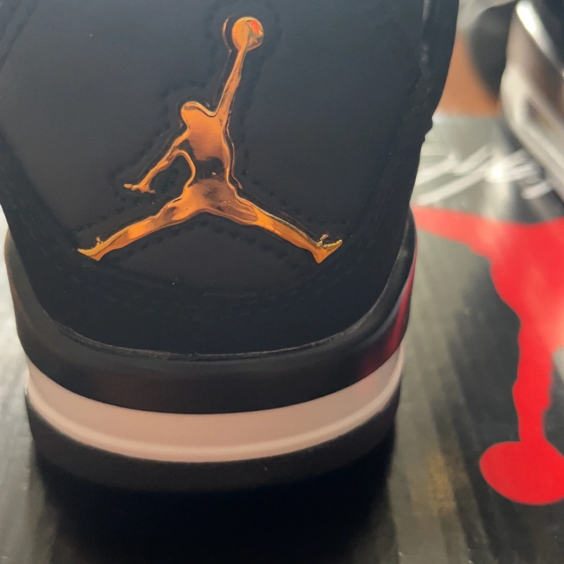 Säljer ett par Nike Air Jordan 4 Retro i svart med guldiga detaljer och vit sula. Skorna har klassisk meshpanel, snörning och Jumpman-logga i guld på innersulan. Stilren och ikonisk siluett som sticker ut med sina kontrasterande färger.