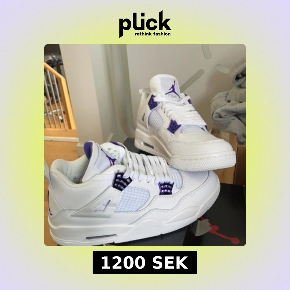 Snygga vita Nike Air Jordans med lila detaljer. Skorna har snörning och en ikonisk Jumpman-logga på hälen och sulan. Perfekta för dig som vill ha en stilren och sportig look.