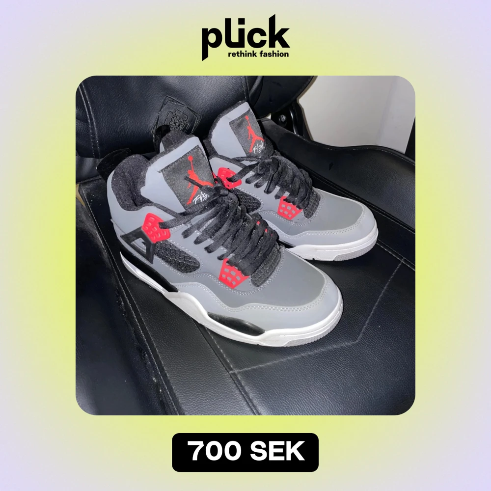 Säljer ett par snygga Nike Air Jordans i grått med röda detaljer. Skorna har svart snörning och en vit sula. Perfekta för både vardag och fest! De är i mycket bra skick och redo för nya äventyr.