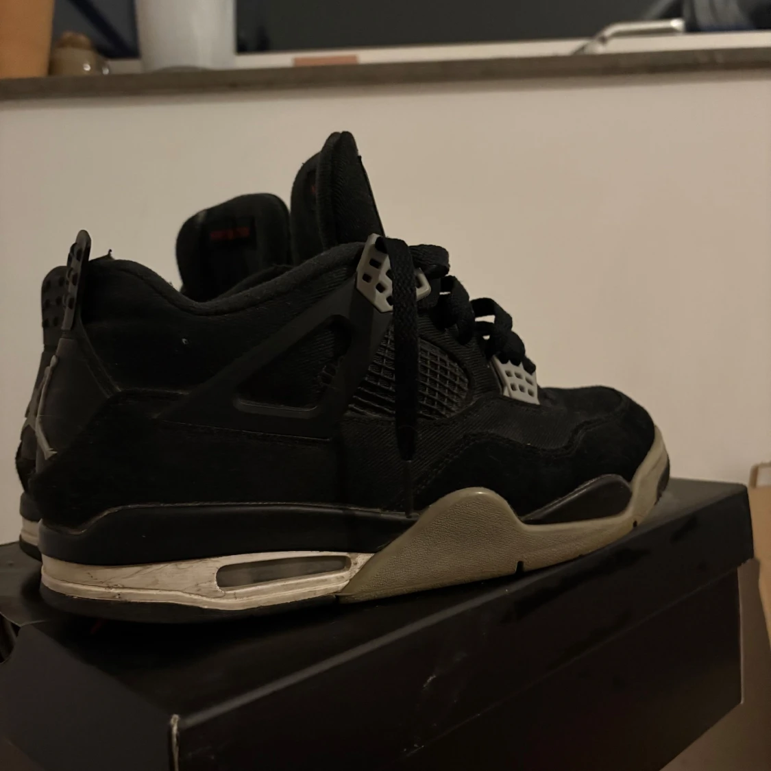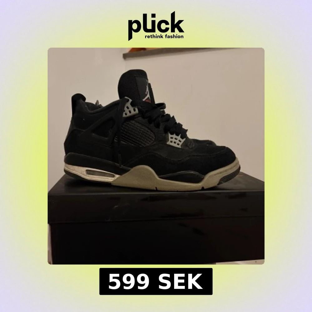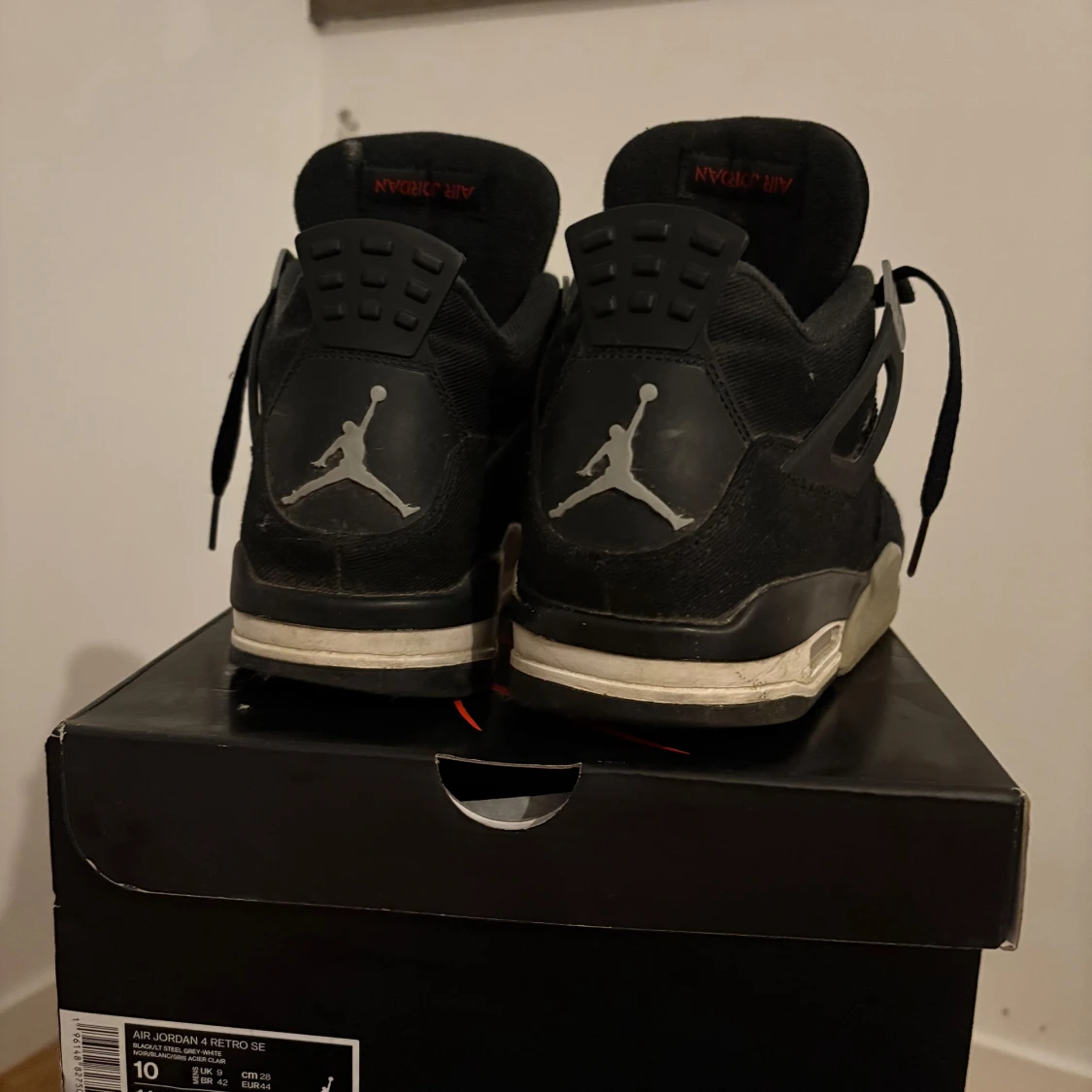 Nike Air Jordan 4 Retro SE i svart och grått med klassisk Jumpman-logga på hälen. Skorna har meshpaneler, snörning och detaljer i plast. Snygg kontrast mellan svart mocka och grå sula. Perfekta för dig som gillar streetwear och ikoniska sneakers. Köpta från Merch sweden