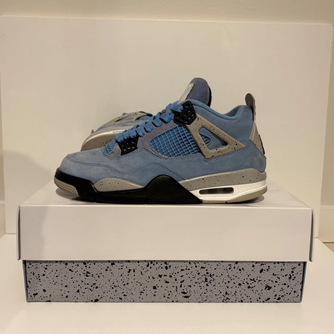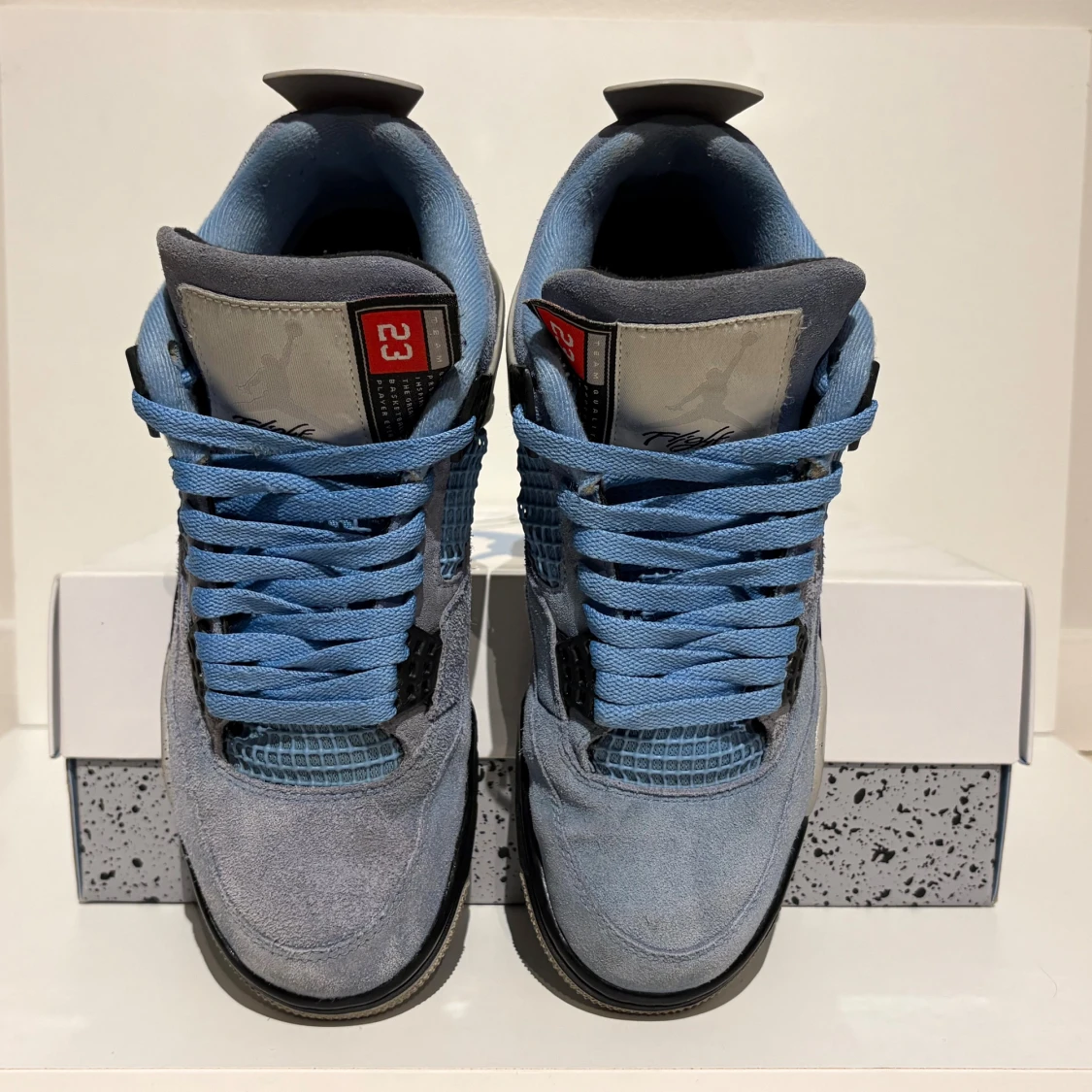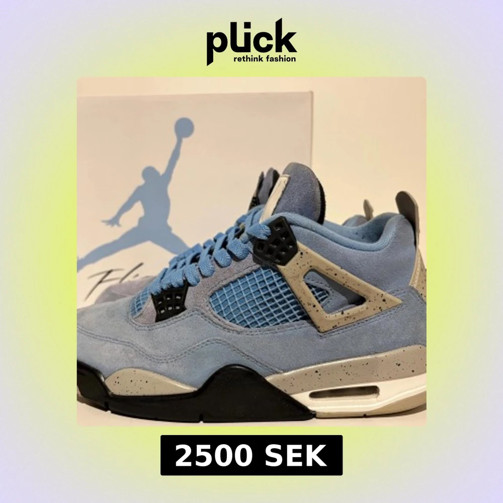 Nike Air Jordan 4 University Blue med ljusblå mocka, meshpaneler och grå detaljer med svarta stänk. Skorna har svarta och grå plastdetaljer, blå snörning och tydlig Jumpman-logga på plösen. Snygg kontrast mellan blått, grått och svart gör dem till ett statement på fötterna.