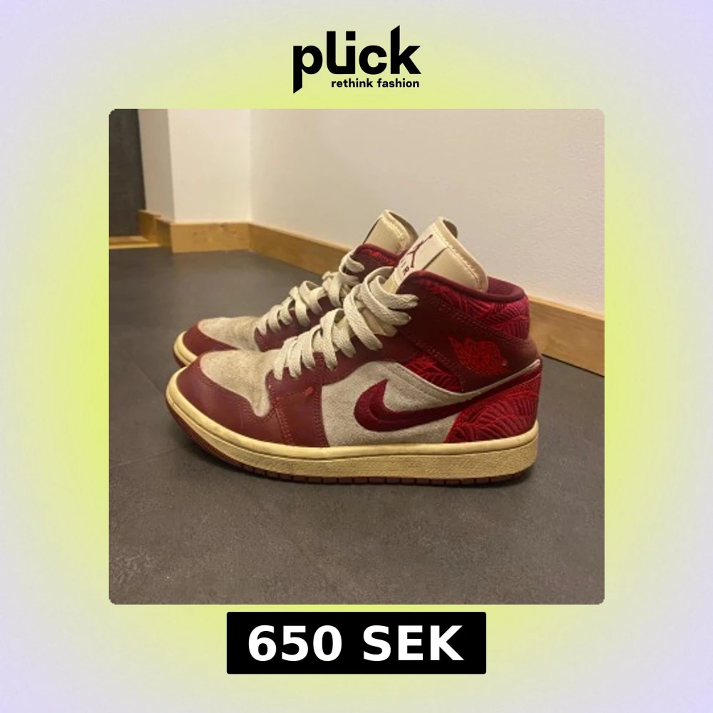 Snygga Jordans i färgen tiki leaf i en cool kombination av röd och beige. Skorna har en klassisk snörning och den ikoniska Air Jordan-loggan på plösen. Perfekta för dig som vill ha en stilren och sportig look. Dem är i bra skick men lite smutsiga men går lätt att bara tvätta av med lite vatten. Dem är köpta från Nike.