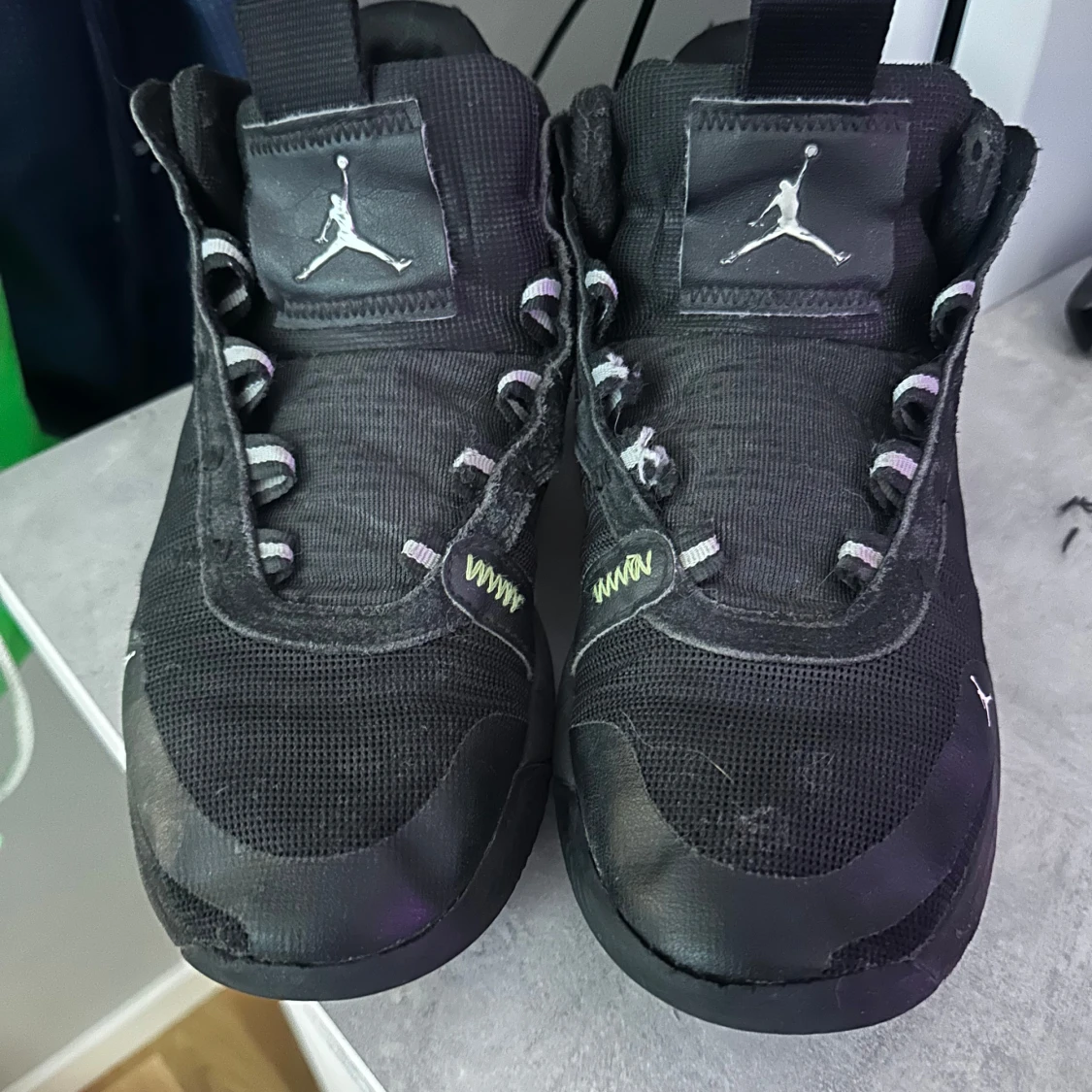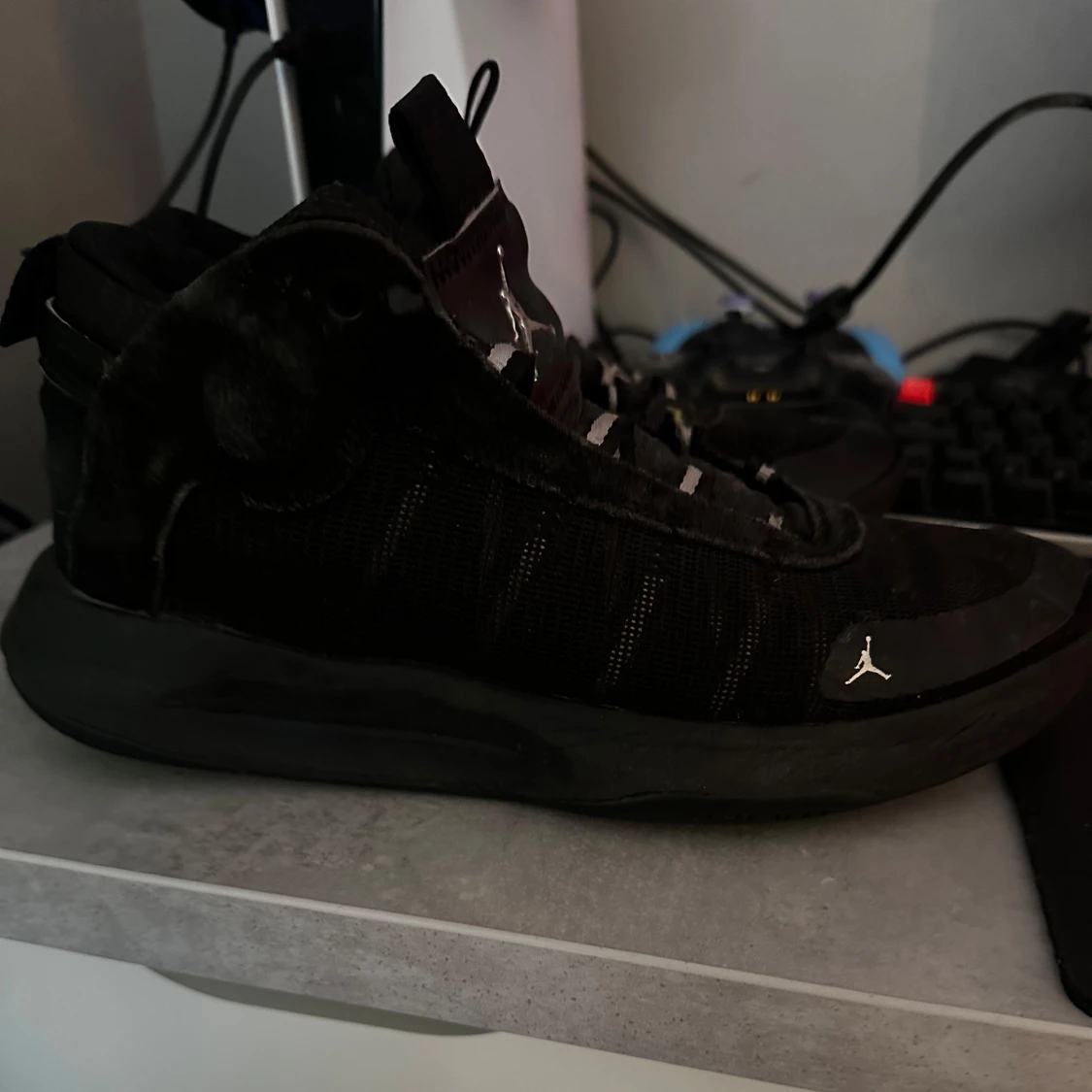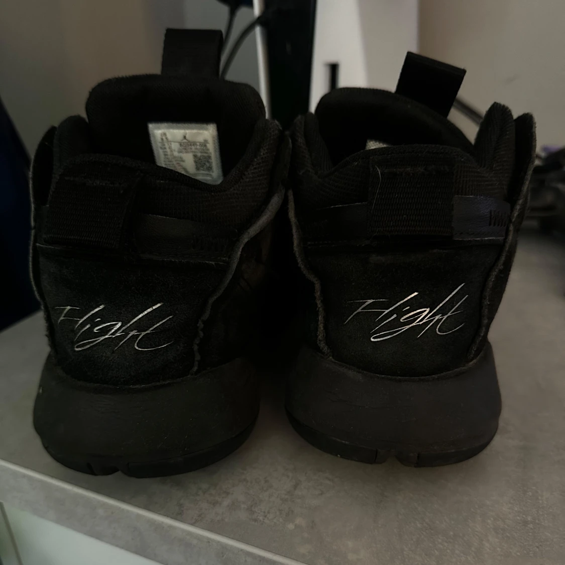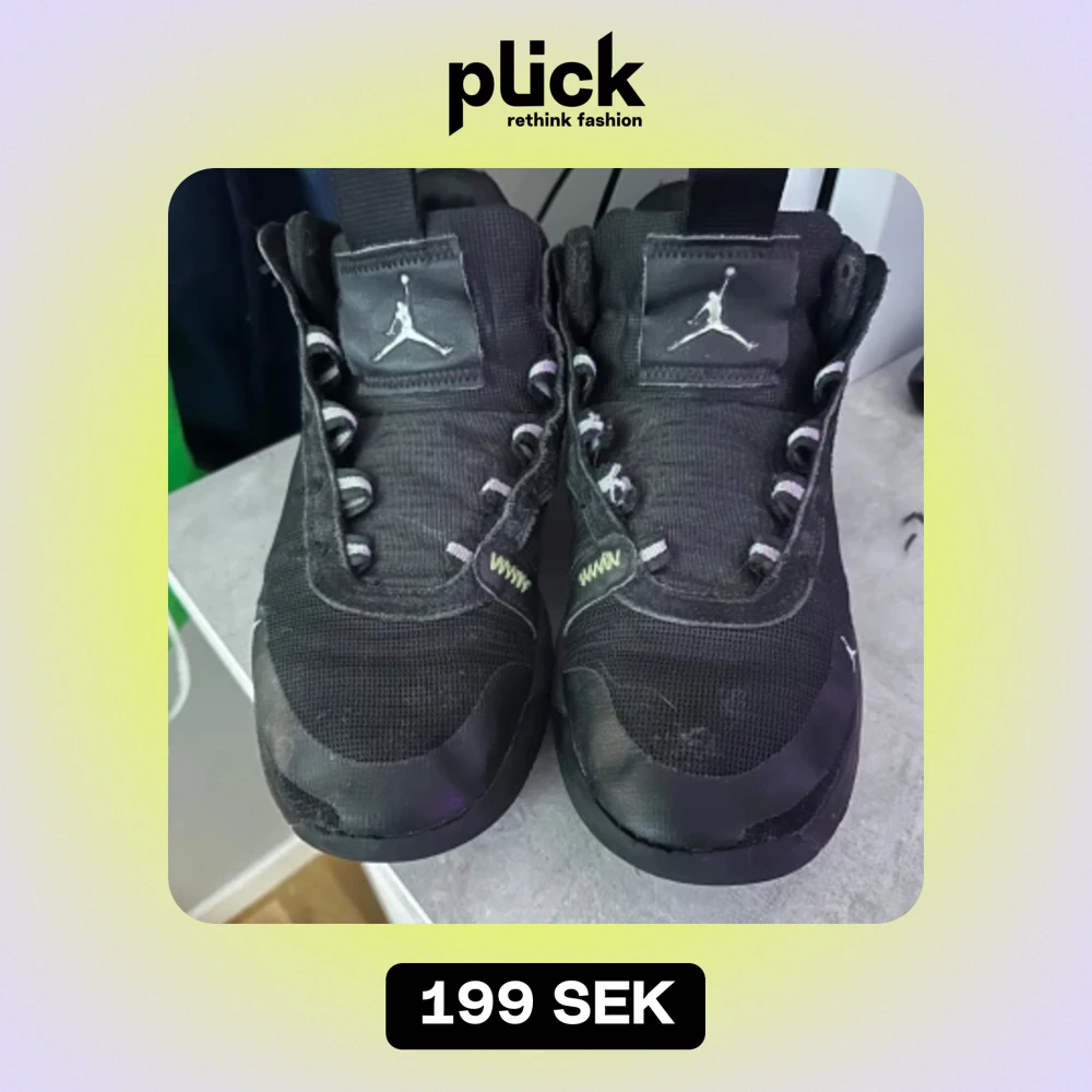 Säljer dessa feta Jordan dojor. Skorna har en cool design med en ovanlig text där bak. Storleken är 42. Skorna är inte i perfekt skick men har fortfarande mycket kvar att ge!